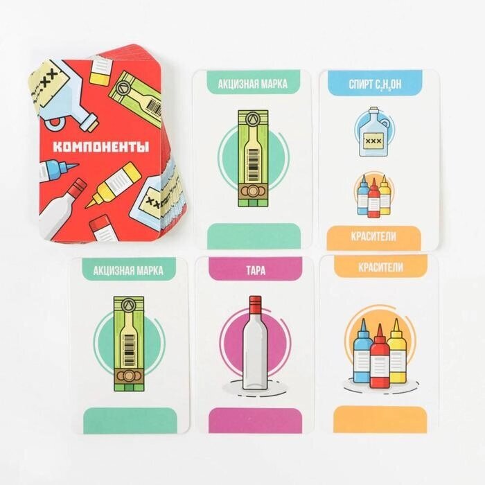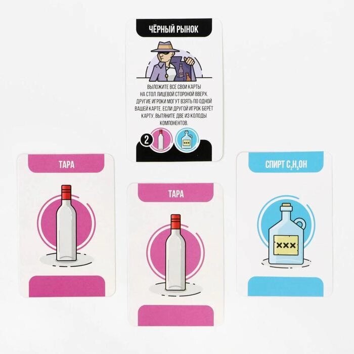 - Скинуть с руки необходимые карты компонентов, чтобы купить бутылку палёного алкоголя. Если игрок видит, что из его карт собралась комбинация, он может с её помощью купить бутылку палёного алкоголя. Поздравляем, в вашем арсенале на одну бутылку палёнки больше!
