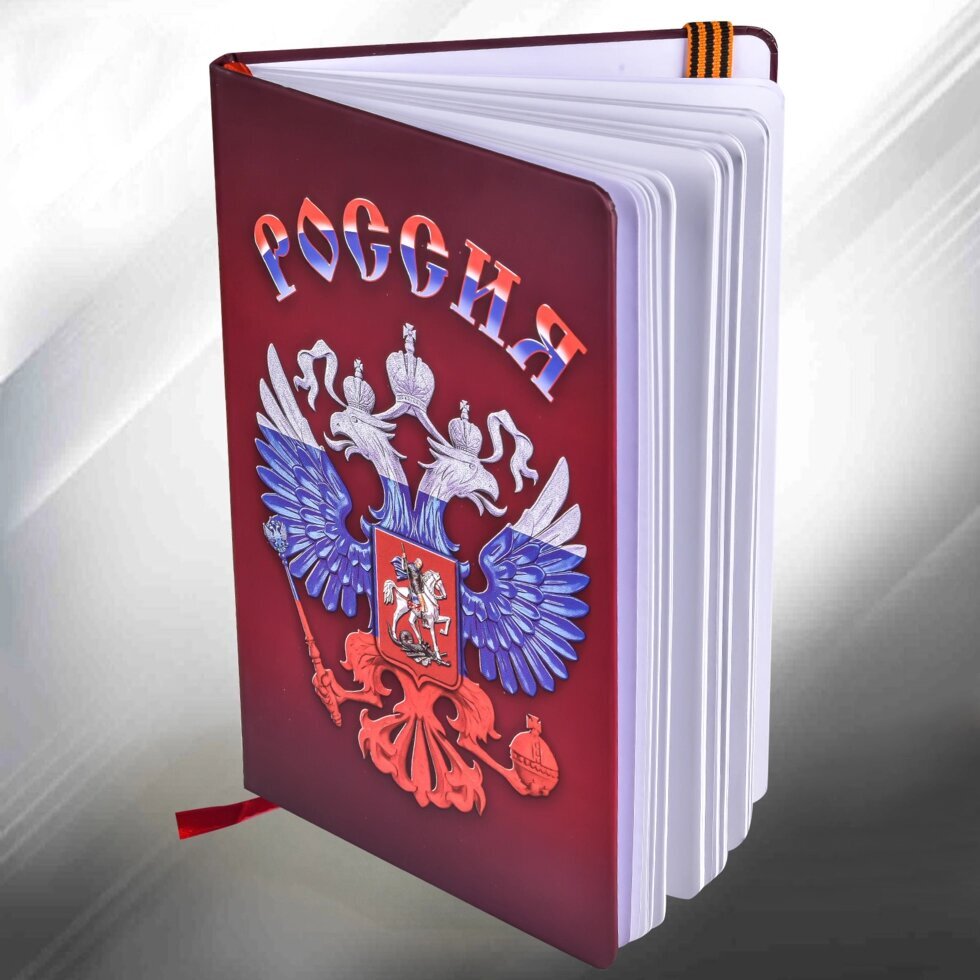 Блокнот "Герб России" в жестком переплете, скрепленном фиксирующей резинкой.