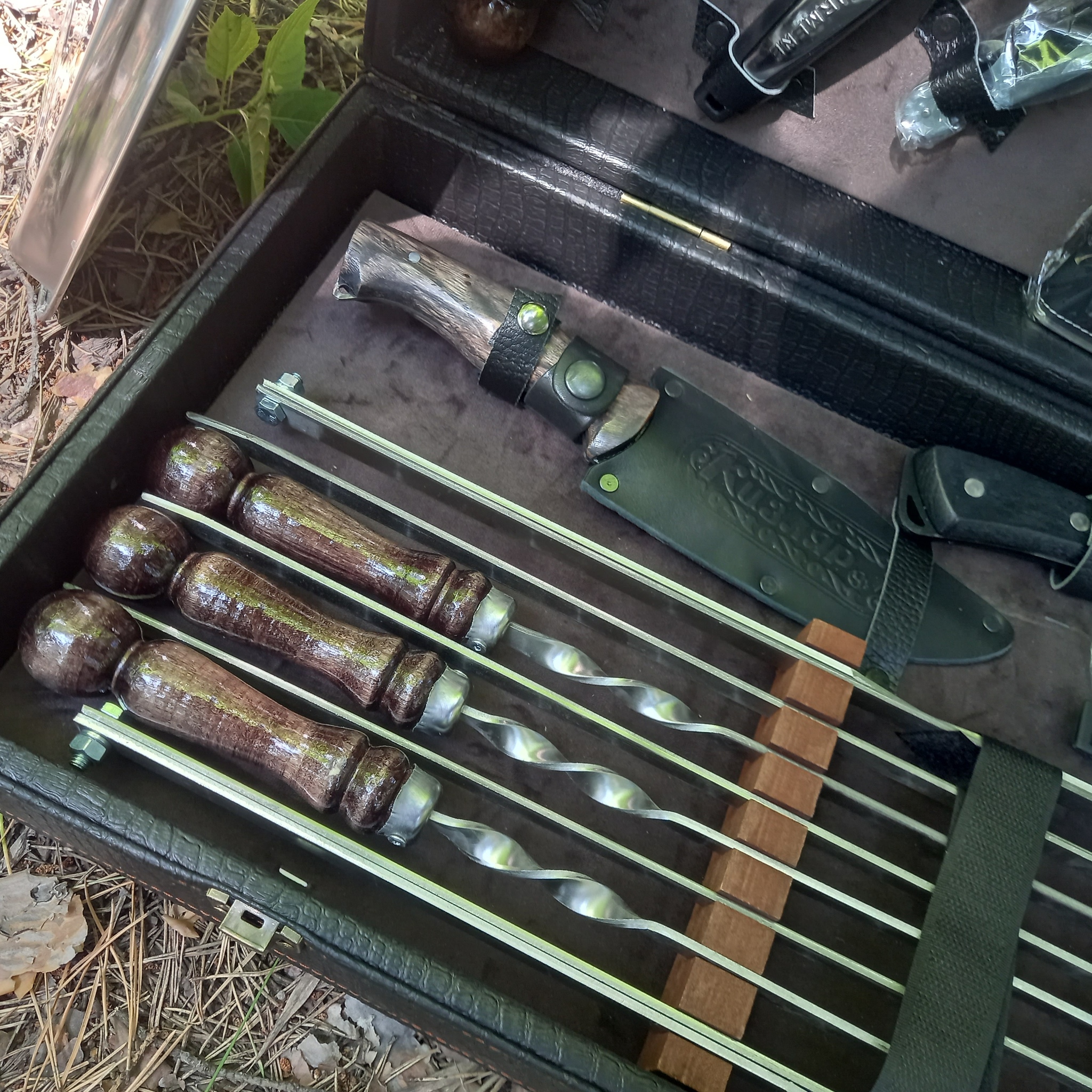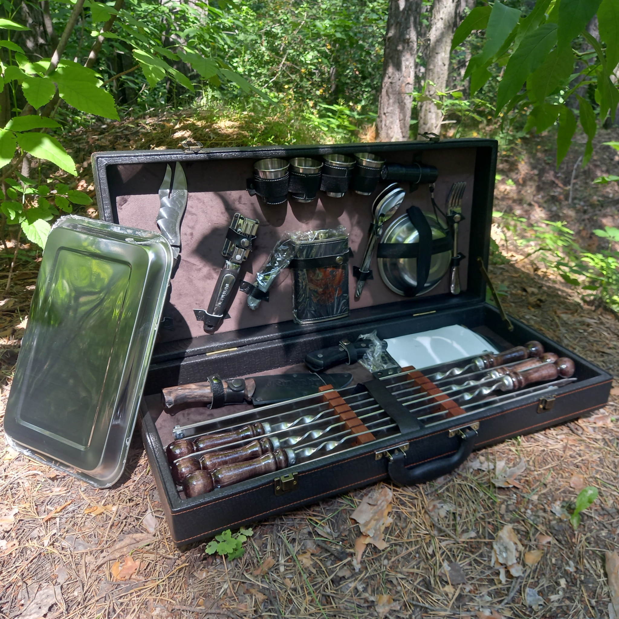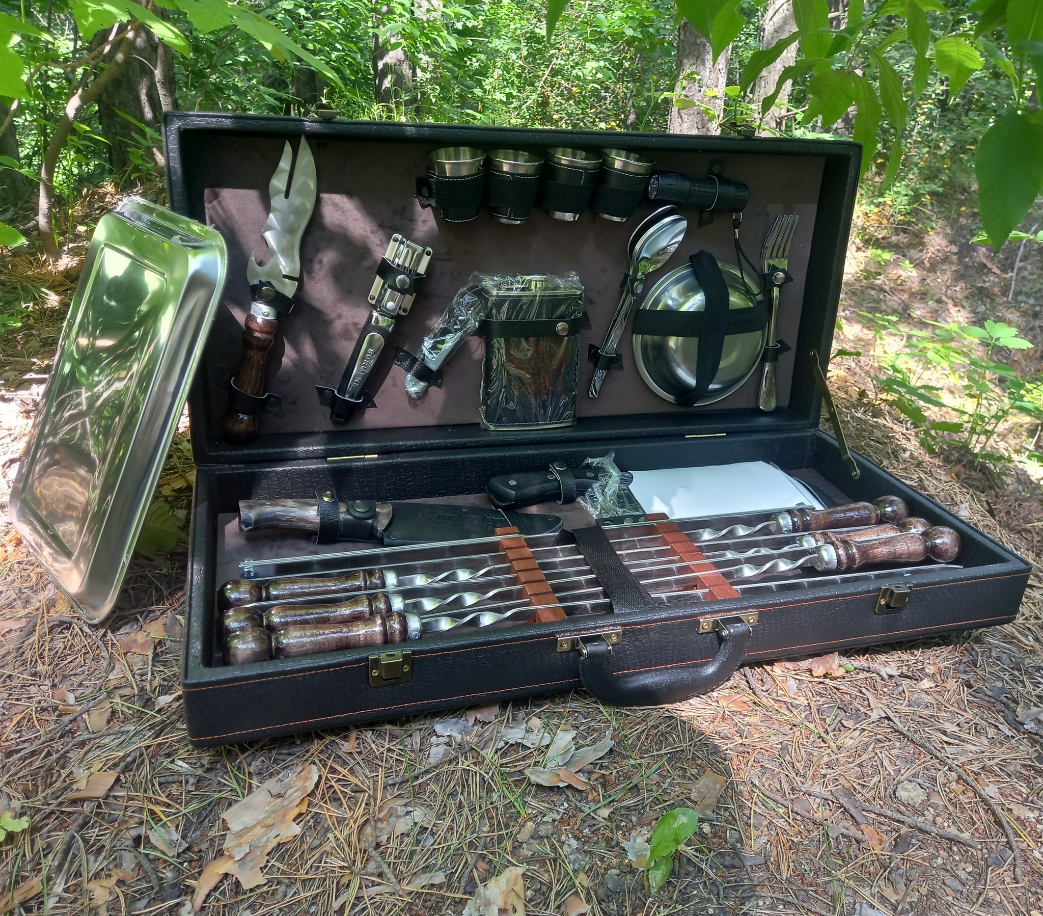 Набор для шашлыка подходит для дачи, пикника, отдыха на природе, туризма, охоты, рыбалки. Чехол может быть использован как походный набор для кемпинга. Чемодан удобно хранить и перевозить.
