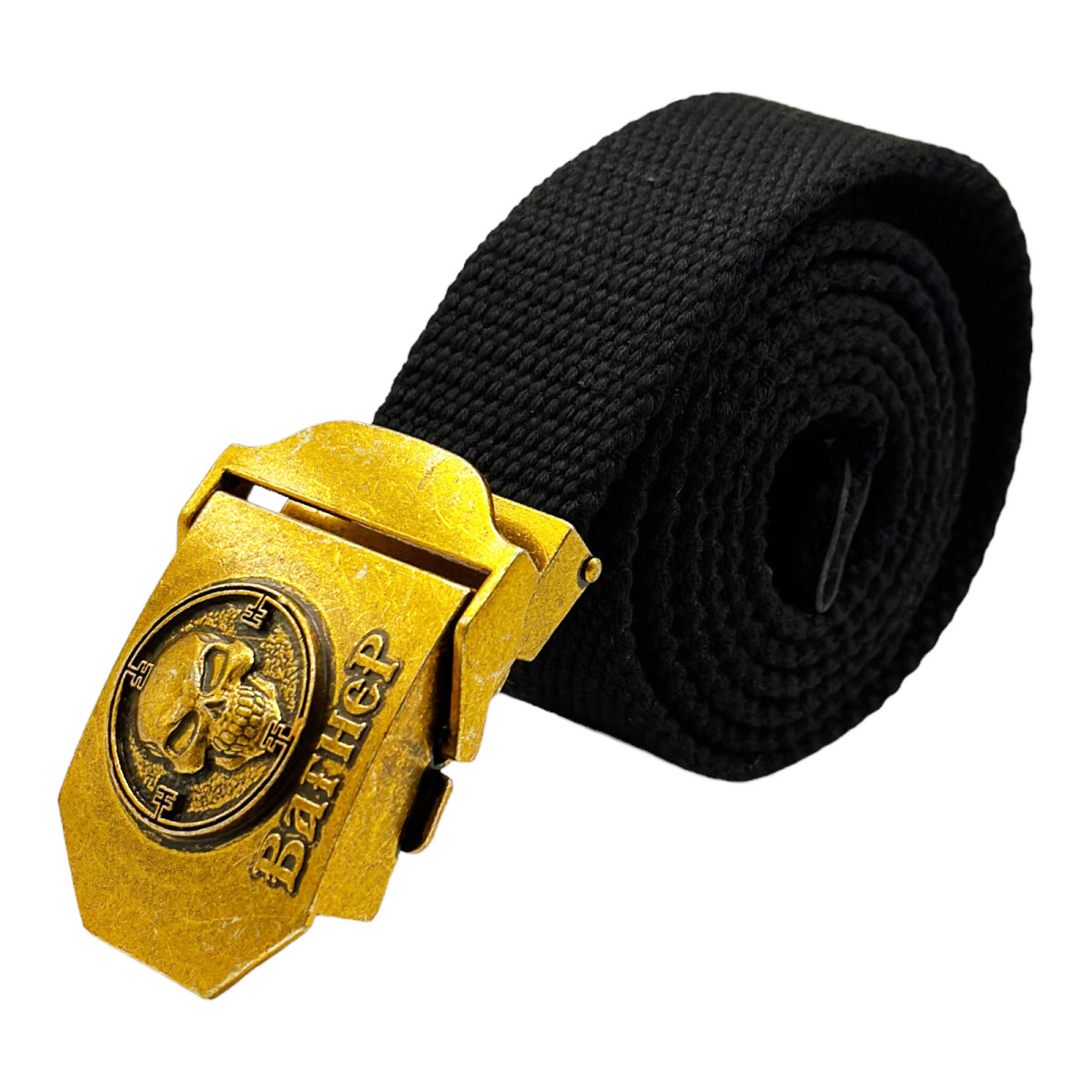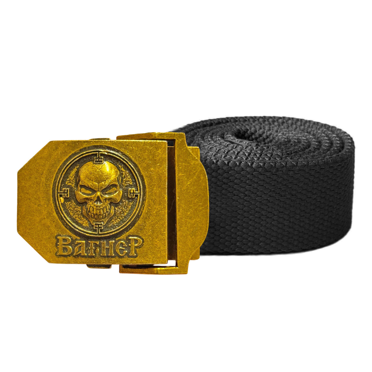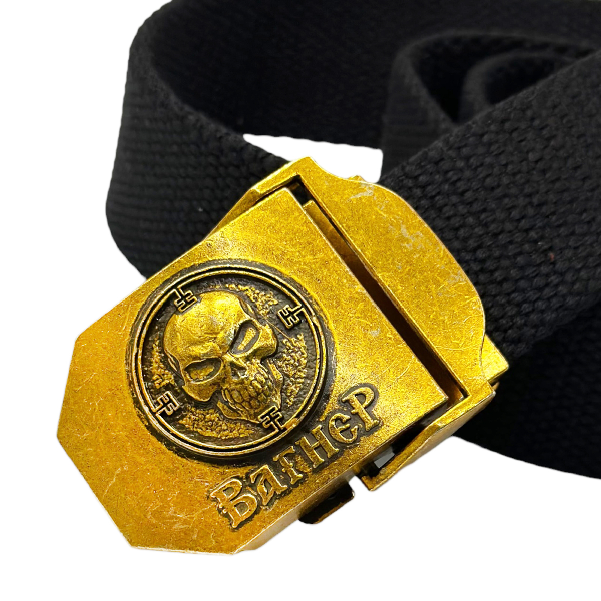 Мужской текстильный ремень со стальной пряжкой. Пряжка декорирована объемным авторским принтом с символикой ЧВК Вагнер.