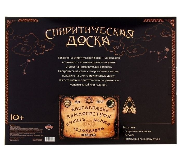 Внутри вы найдёте поле для вызова духов, специальный бегунок и правила проведения спиритического сеанса. Для успешного контакта требуется как минимум два человека, один из них будет медиумом. Он и вступит в разговор с духами. Зажгите свечи и настройтесь на связь с потусторонним миром. Определившись, кого вы будете вызывать, разложите поле, дотроньтесь кончиками пальцев до деревянного бегунка и начните сеанс общения. Задавайте интересующие вопросы, а бегунок придёт в движение и сам укажет на нужные буквы. Будьте тактичны и деликатны, духов не стоит злить! А в самом конце не забудьте попрощаться и отпустить духа.