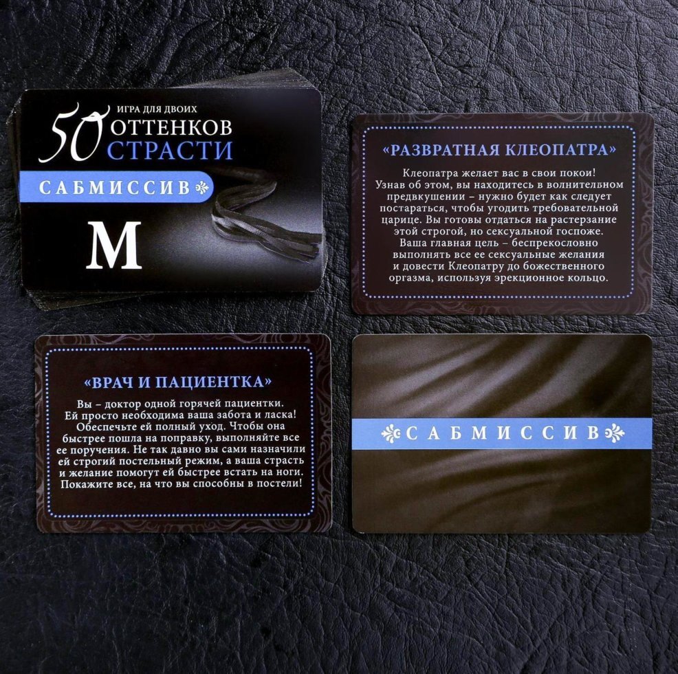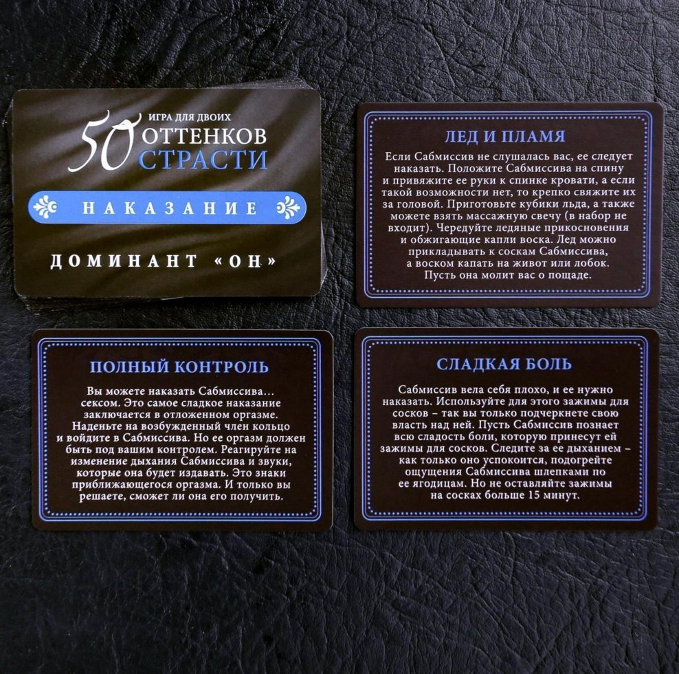 Для начала распределите роли и вручите друг другу по контракту. Кто-то из вас будет доминантом, а другой — сабмиссивом. Разыграйте один из жарких ролевых сценариев. А после решите, поощрения или наказания заслуживает сабмиссив. Вытягивайте карточки из соответствующих колод и воплощайте все фантазии в жизнь! А испытать наивысшее наслаждение от игры вам помогут горячие аксессуары.