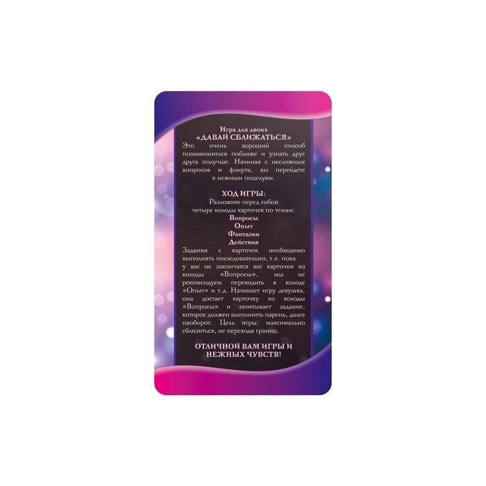 Перед вами четыре колоды карт. Выполняйте все задания последовательно, пока в каждой колоде не закончатся фанты! Отвечайте на вопросы, делитесь опытом и фантазиями, а затем переходите к более решительным действиям. Вытягивайте карточки и ловите каждое мгновение, ведь это так важно — узнавать друг друга в самом начале отношений. Задания из набора позволят вам открыться перед партнёром с новой стороны, а ваши чувства будут крепнуть с каждым днём!