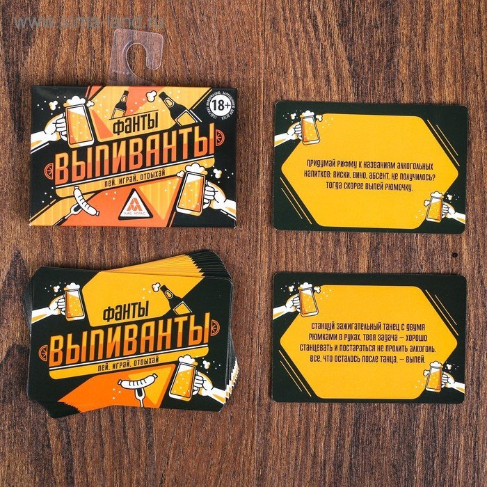 В распоряжении участников 2 колоды. Игрокам нужно по очереди переворачивать карточки из обеих колод, соединять их в один фант и выполнять задание/