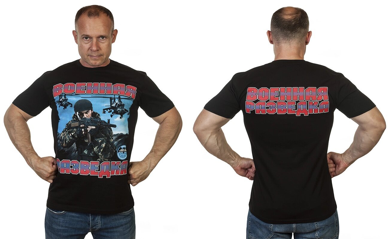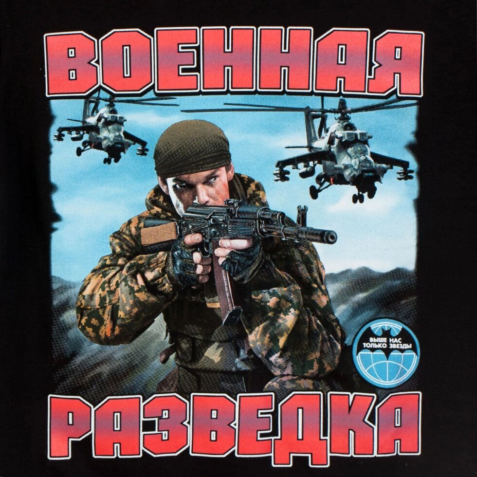 На футболке изображён «Спецназовец ГРУ», во время боевых действий в Афганистане, на фоне двух вертолётов «МИ -24», а также эмблема «Военной разведки» и крупная надпись «Военная разведка».