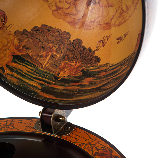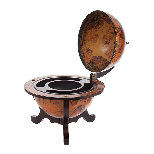 Данный глобус-бар обычно оснащен откидывающейся крышкой, под которой находится внутренний бар с полками для хранения бутылок и стаканов.