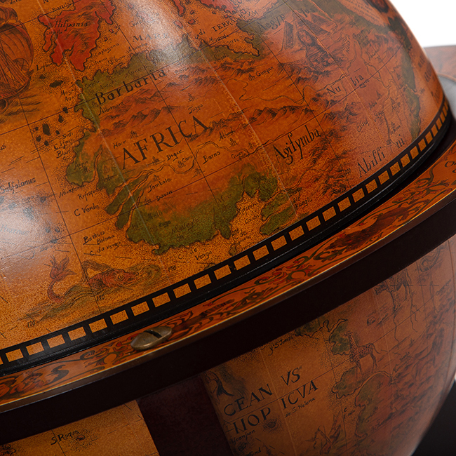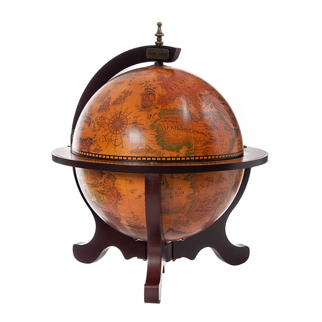 Некоторые модели также имеют колесики для удобства перемещения. Глобус-бары часто изготавливаются из дерева или металла, а сфера обычно покрыта картой мира или другими декоративными элементами.