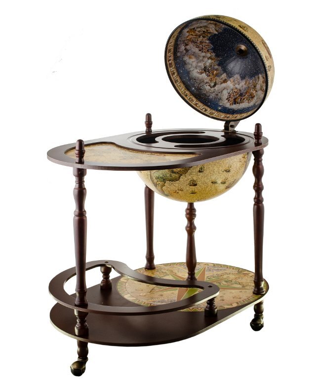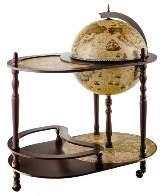 Глобус-бар - яркая деталь интерьера, он похож на бесценный предмет антиквариата. Рабочему кабинету антикварный глобус добавит солидности, статуса. Данная модель размещена на высокой деревянной подставке на колесиках, с полочкой для хранения бутылок. Может использоваться как сервировочный или журнальный столик. Приобретайте в нашем интернет-магазине по лучшей цене.