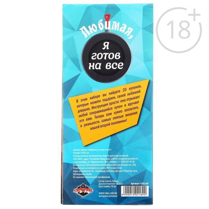 В наборе вы найдёте купоны, которые отдадут вас целиком во власть желаний возлюбленной. Девушка открывает любую понравившуюся карточку и вручает её вам, когда захочет. Вы же обязуетесь воплощать все горячие фантазии любимой!
