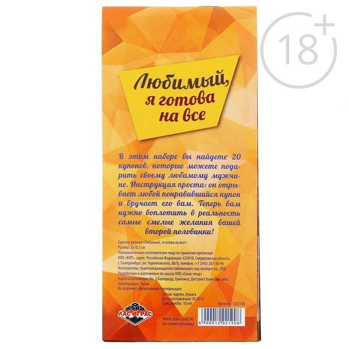Мечтаете удивить своего парня, но не знаете, как? Тогда горячие купоны «Любимый, я готова на всё» непременно придутся по вкусу вам и вашей половинке. Внесите капельку страсти и нежности в ваши отношения!