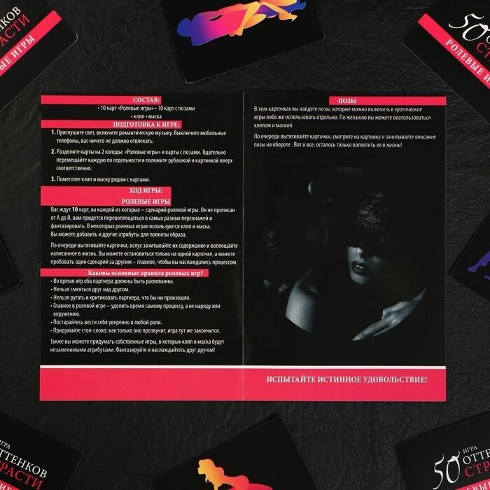 Вас ждёт 10 карточек, на каждой из которых — сценарий ролевой игры. Он не прописан от А до Я, вам нужно будет фантазировать. В некоторых ролевых играх используются кляп и маска. Вы можете добавить и другие атрибуты для полноты образа.