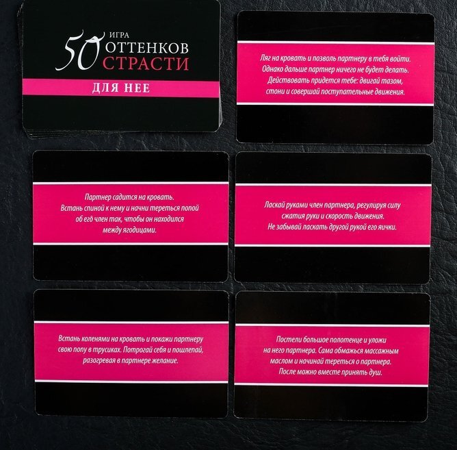 Приглушите свет, включите романтическую музыку. Уберите подальше мобильные телефоны, чтобы ничего не отвлекало от процесса. Определите, кто начнёт игру. Если это девушка, то она вытягивает карточку из колоды «Для неё». Если это мужчина — из колоды «Для него». Зачитывайте фант и выполняйте его.