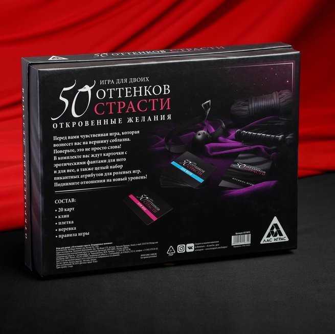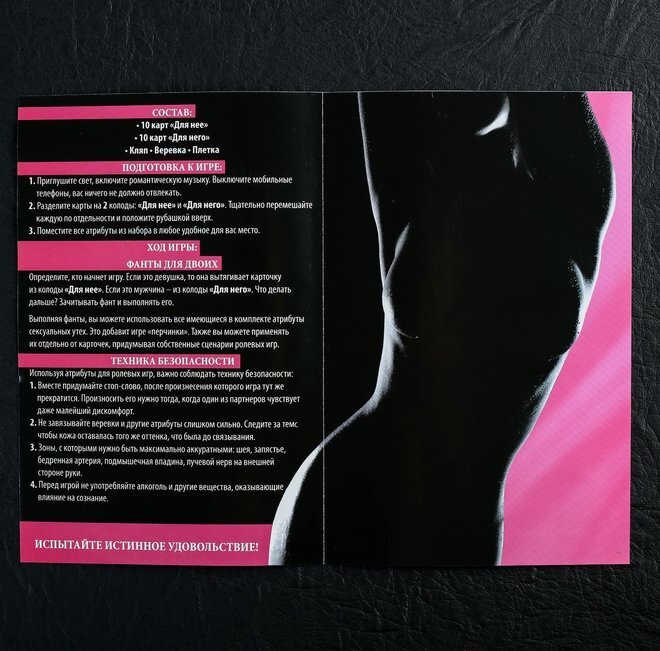 Перед вами чувственная игра, которая вознесёт вас на вершину удовольствия. Поверьте, это не просто слова! В комплекте вас ждут карточки с эротическими фантами для него и для неё, а также целый набор пикантных атрибутов для ролевых игр.