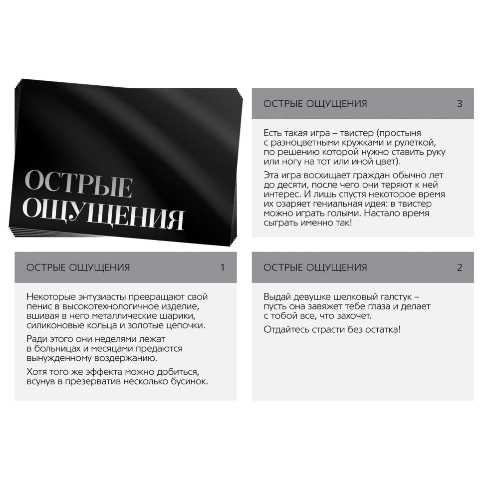 Добавьте перчинки в ваши отношения — поверьте, вы и ваша вторая половинка не разочаруетесь. Тяните карту, выполняйте указанное на ней задание и окунайтесь в мир острых ощущений, ярких эмоций и головокружительных чувств!