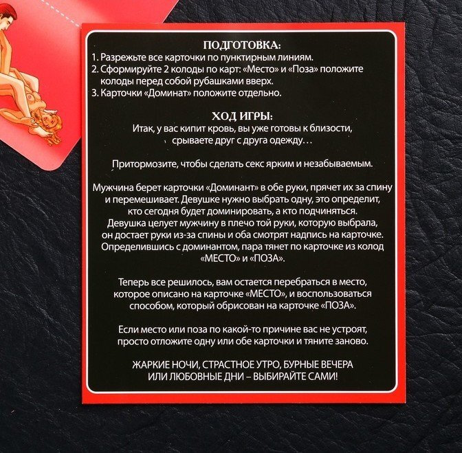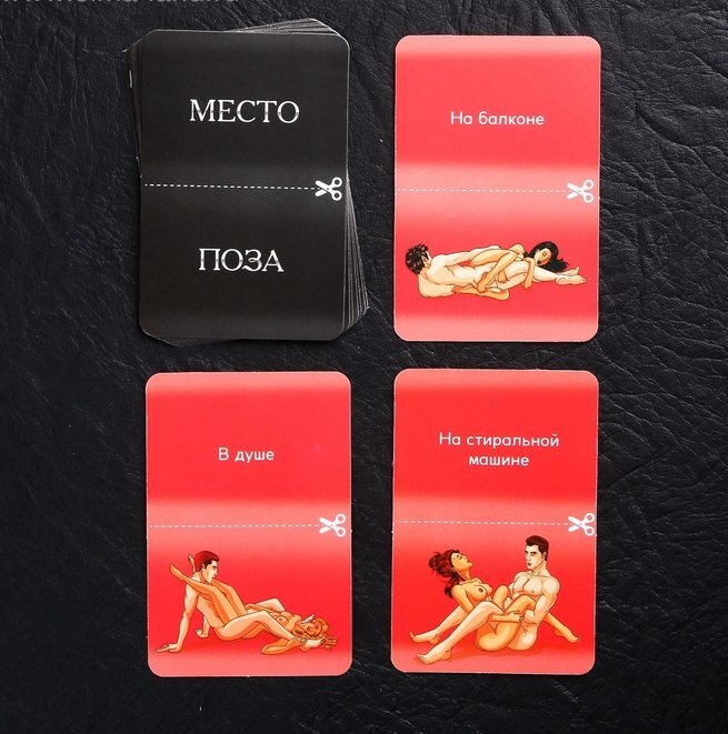 Определившись с этим моментом, пара тянет по карточке из колод «Место» и «Поза». Ну а теперь начинается самое интересное — окунитесь в пучину страсти и выполните получившееся задание без промедления!