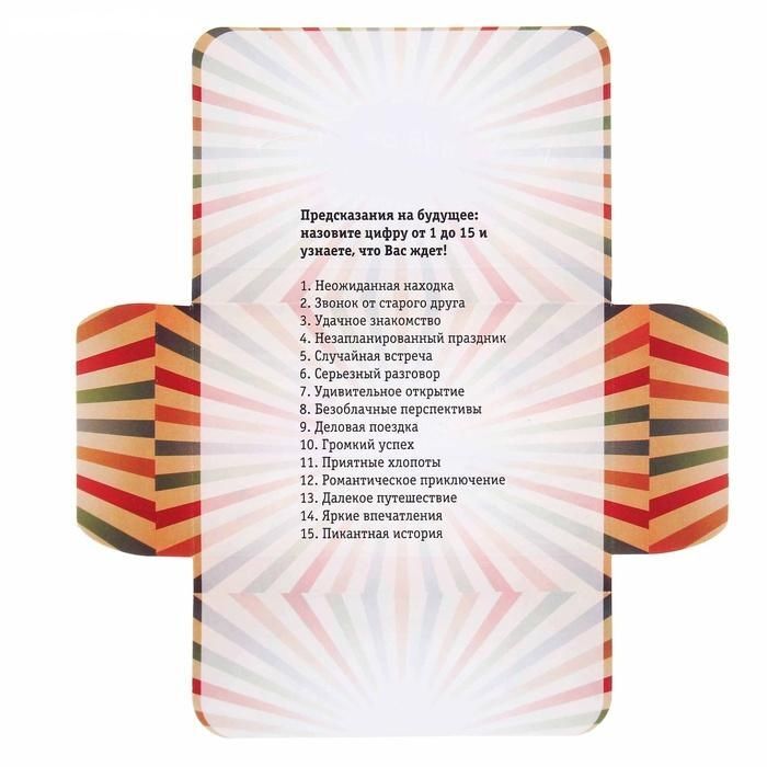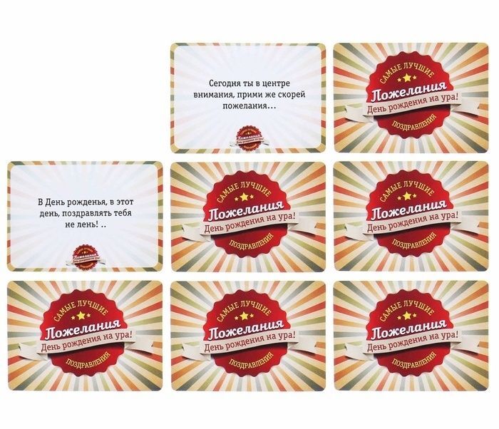 В удобном и компактном конверте вы найдёте не только десяток самых лучших тостов, специально подобранных для этого замечательного праздника, но и карточки с пожеланиями, которые помогут поздравить именинника. И это ещё не всё! Также в этом наборе есть 5 игр, способных поднять настроение любому, а ещё карточки с номинациями, которыми вы сможете наградить гостей в конце вечера. Бонус! Именинника ждёт весёлое гадание на будущее внутри конверта!