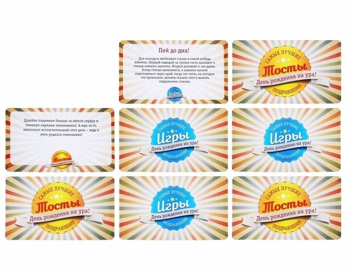 День рождения — это праздник, который мы отмечаем каждый год. И каждый раз мы стараемся провести его на высоте, накрываем на стол, приглашаем гостей и готовимся к веселью. Поздравления, звон бокалов и улыбки близких людей — верные спутники этого праздника. А тосты и игры, которые вы найдёте в этом наборе, станут очень приятным дополнением торжества!
