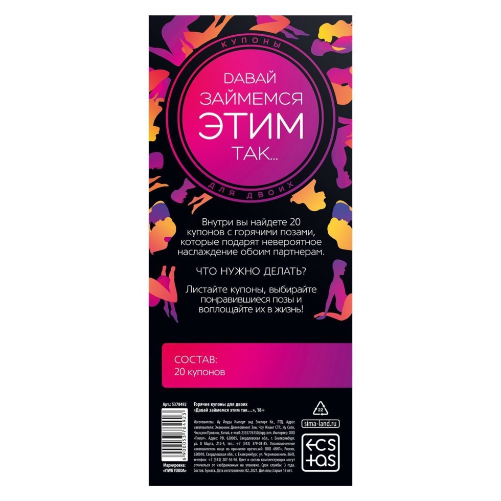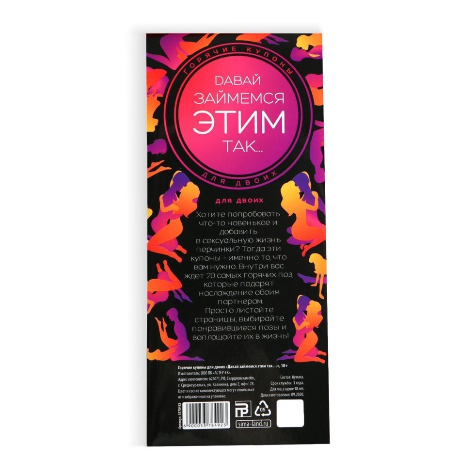 Хотите попробовать что-то новенькое и добавить в сексуальную жизнь перчинки? Тогда эти купоны — именно то, что вам нужно. Внутри вас ждут 20 самых горячих и соблазнительных поз, которые подарят наслаждение обоим партнёрам.