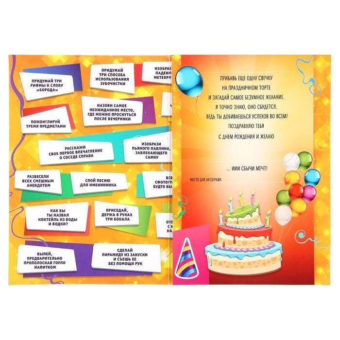 День рождения — самый долгожданный праздник, и хочется порадовать именинника чем-то особенным. Есть идея на миллион! Подарите виновнику торжества открытку с сюрпризом. В ней вы найдёте целую коллекцию игр для вечеринки. Наполняйте бокалы и начинайте веселиться, потому что для вас мы приготовили четыре варианта для развлечения. Сделайте встречу незабываемой!