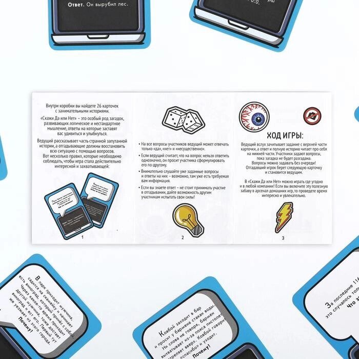 В игре 26 карточек, ведущий берет одну из них и читает загадку, а остальные должны ее отгадать, задавая вопросы, на которые можно ответить только "да" или "нет". Побеждает тот, кто сможет докопаться до правды. Эта игра придется по вкусу всем, кто любит распутывать череду странных событий и отлично проводить время, ведь она полна динамики и бурных обсуждений.