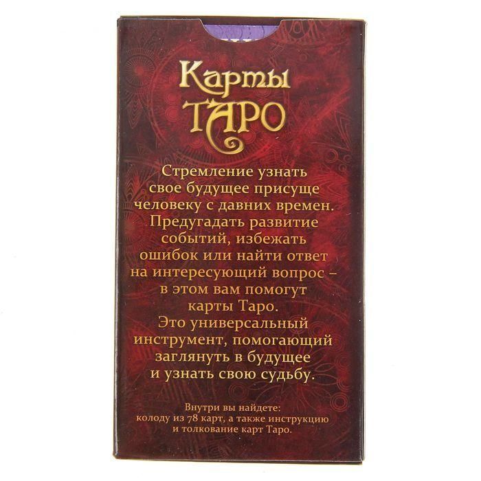 Карты «Таро», 78 шт. – это магическая колода, окутанная ореолом мистики. Испокон веков люди стремятся заглянуть в будущее, предугадать предстоящие события и узнать свою судьбу. Карты Таро – это быстрый путь к ответам на волнующие вопросы.