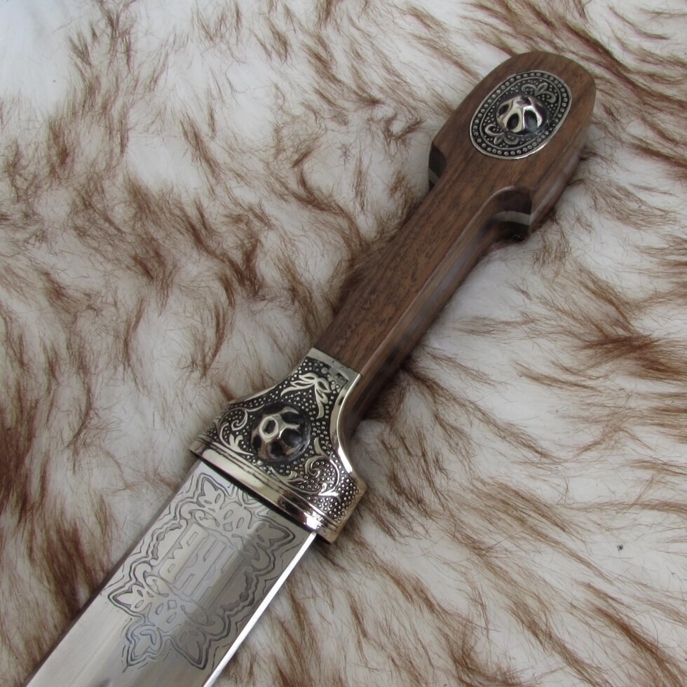 Материал: клинок- нержавеющая сталь 65х13 (50-55 HRC), отделка-мельхиор, эмаль; рукоять- орех
