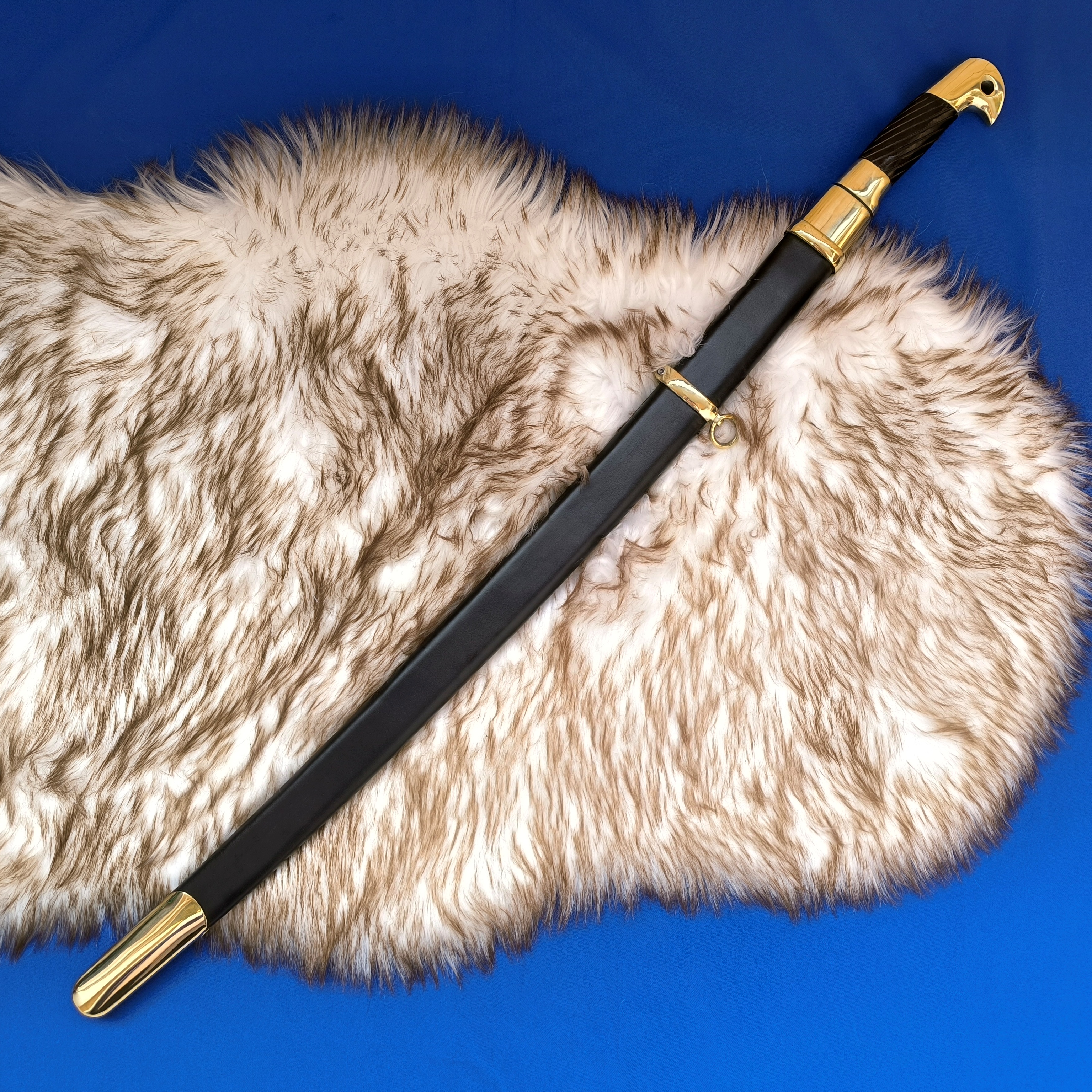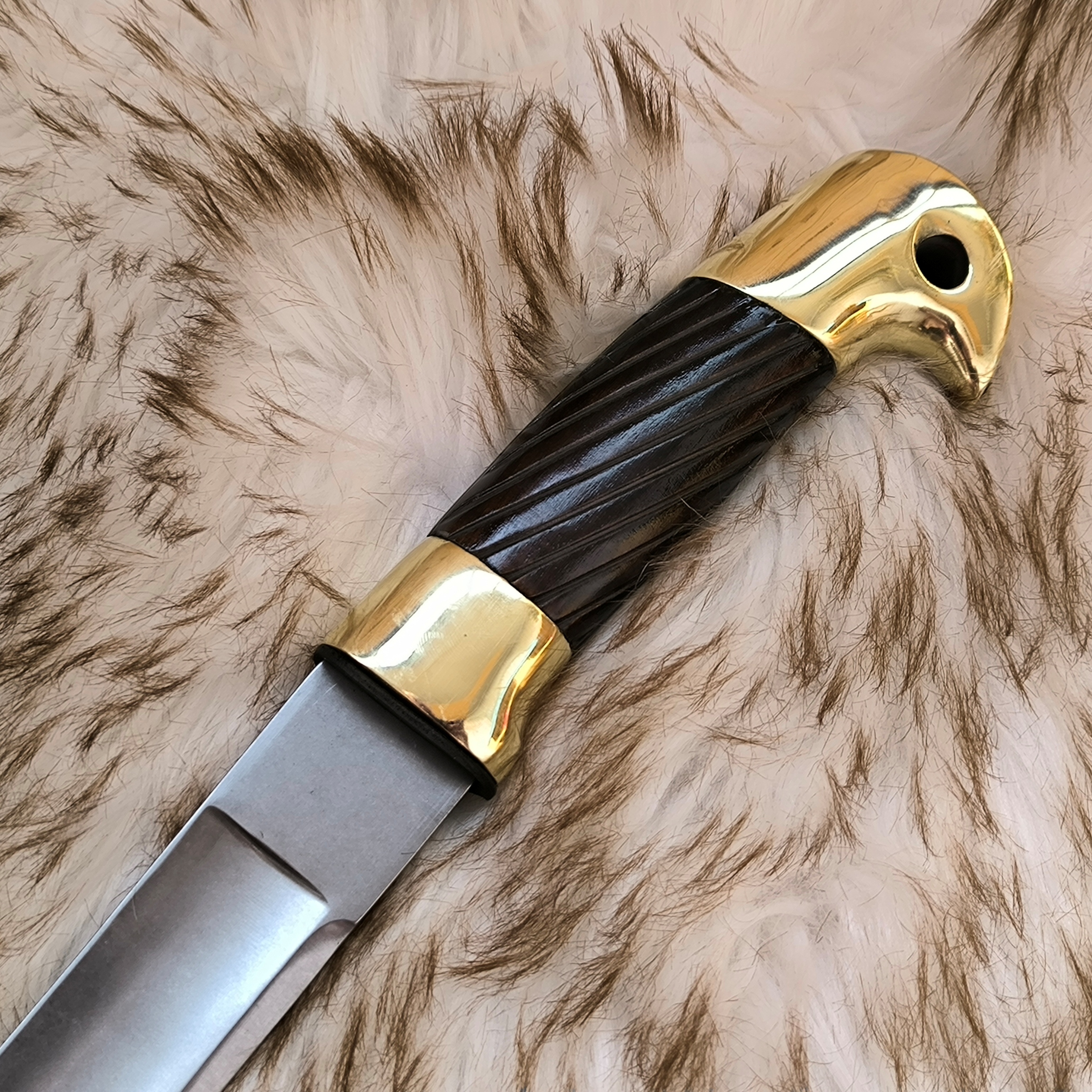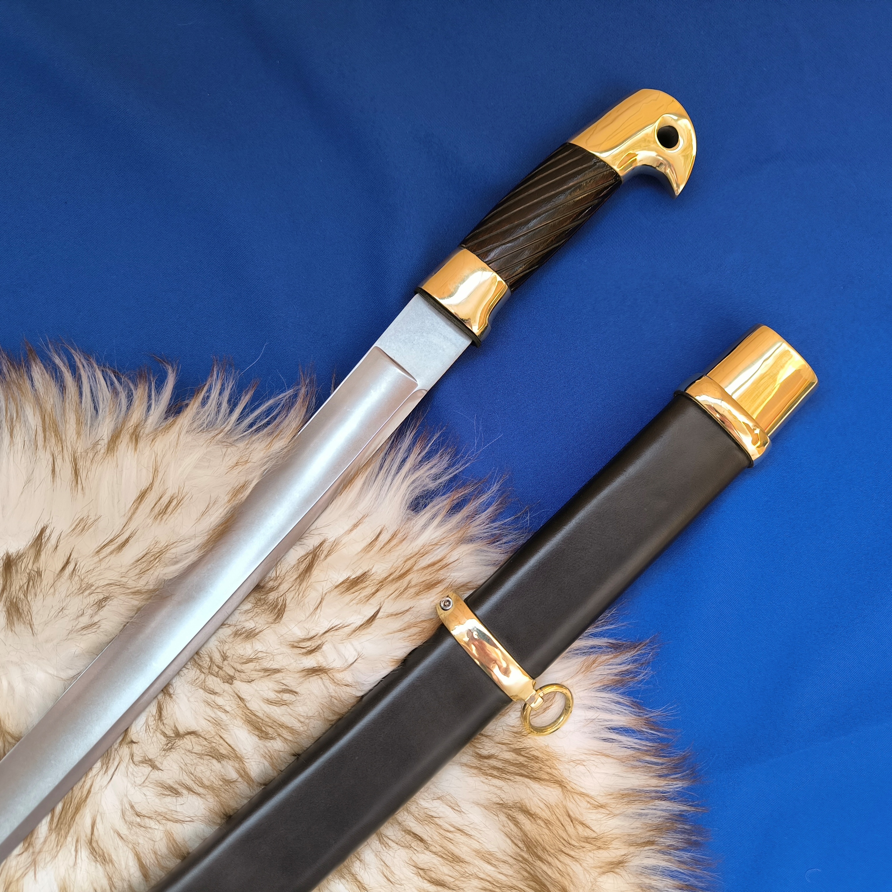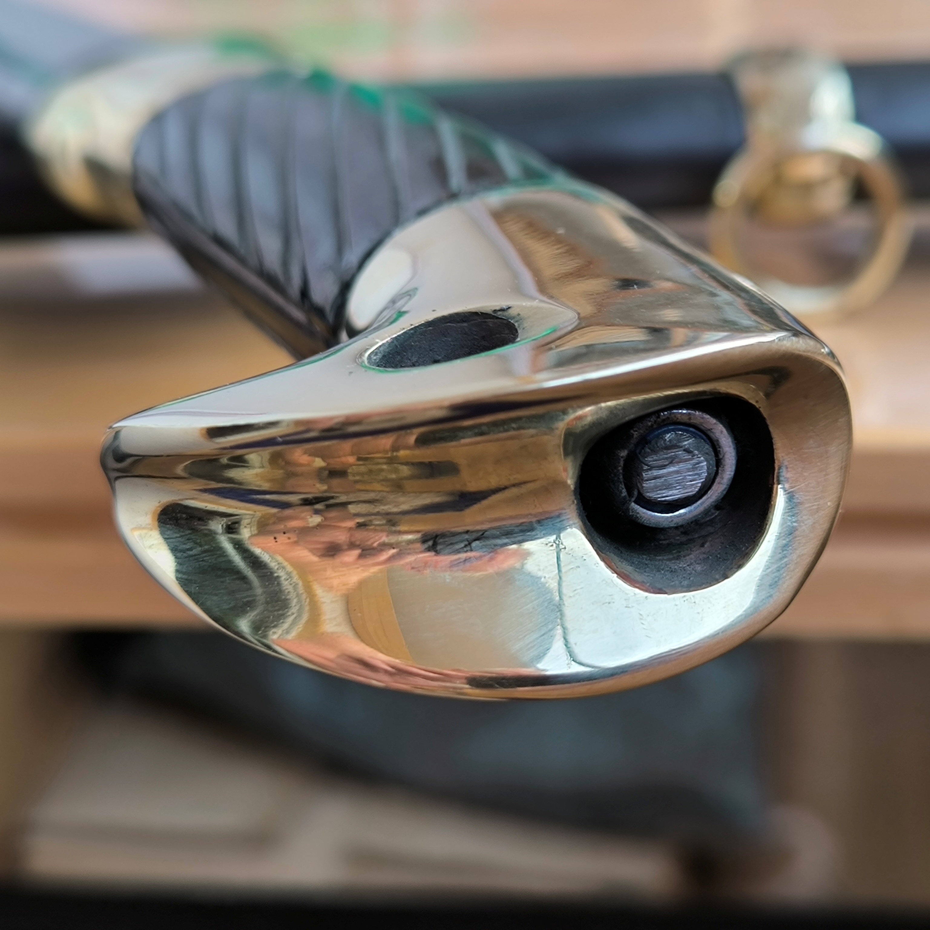 Хвостовик клинка, проходящий через всю рукоять, является цельнокованым и закрепляется снаружи гайкой. Рукоять выполнена из дерева и дополнена латунными приборами.