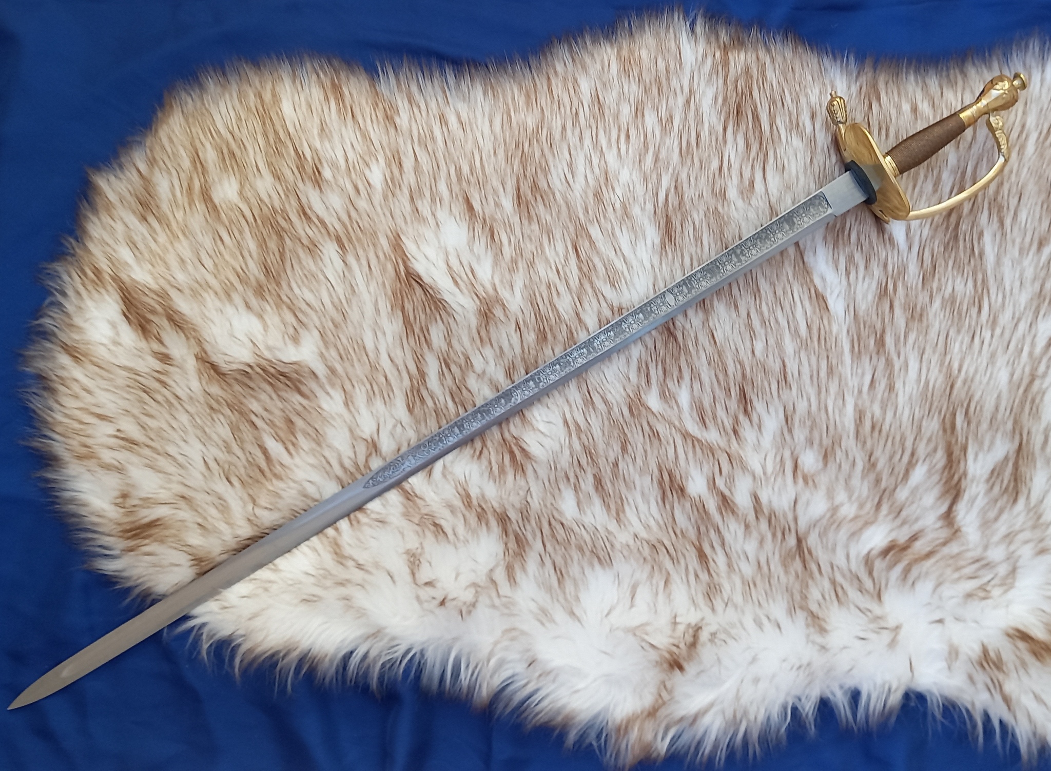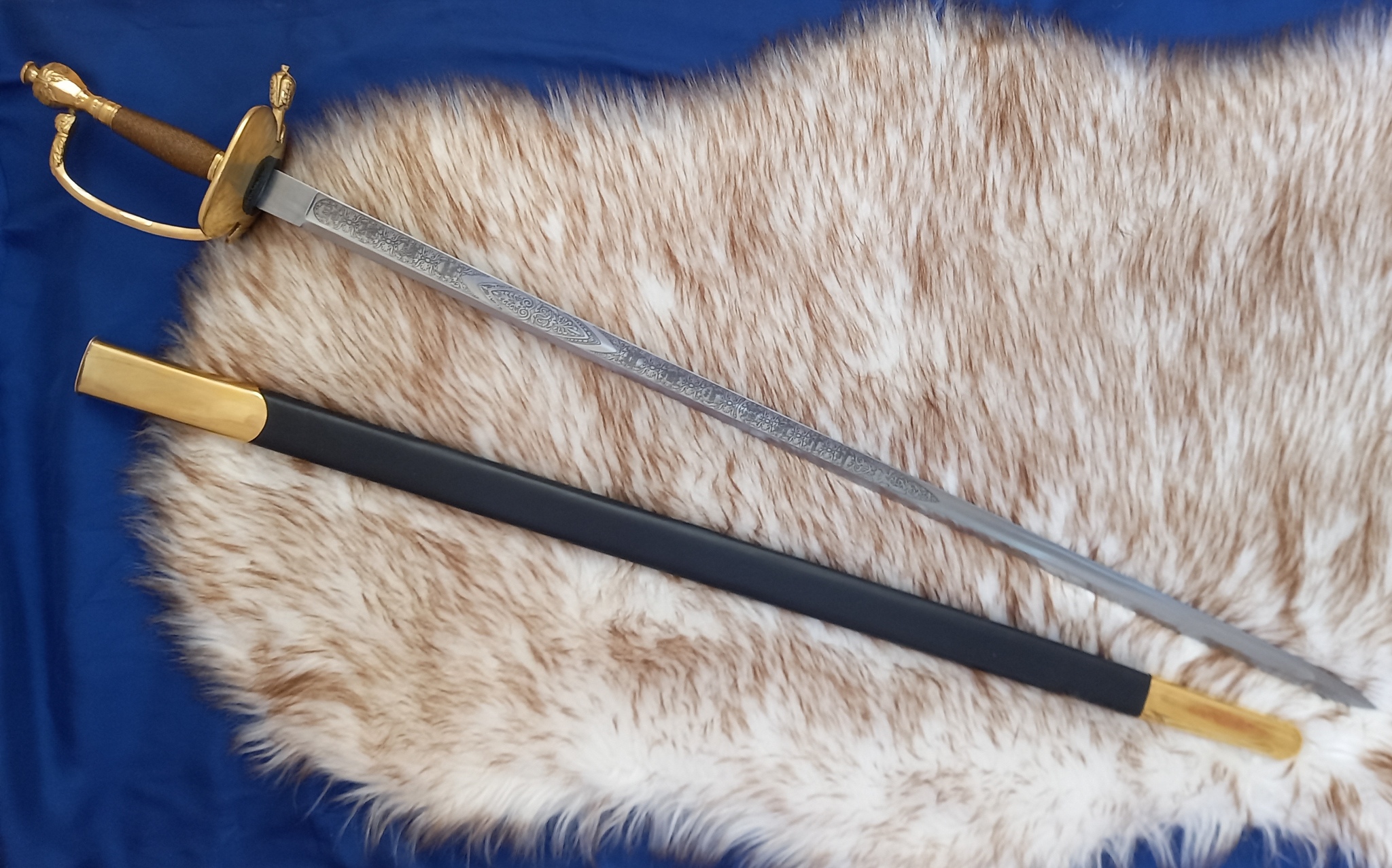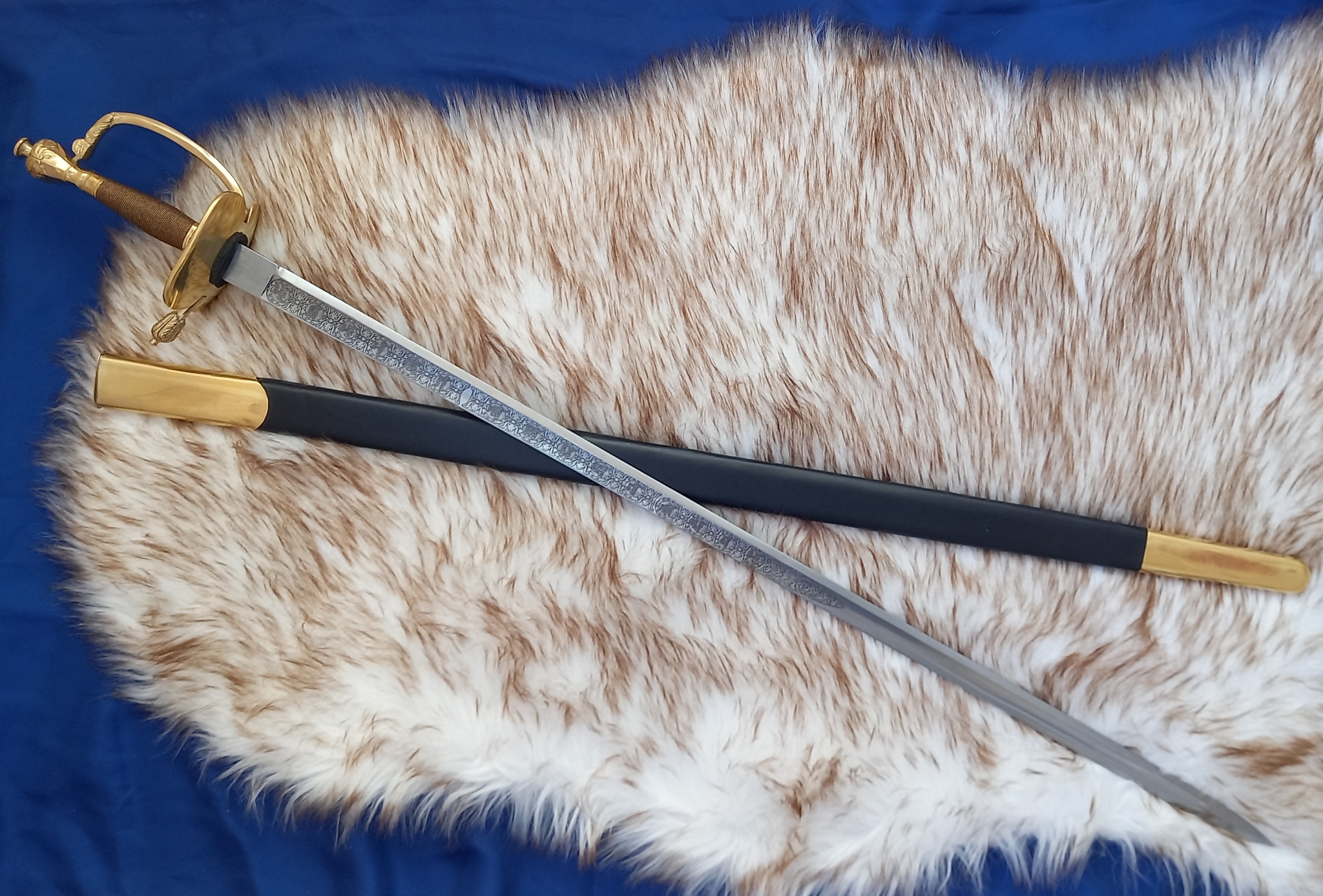 Клинок прямой, кованый, из высокоуглеродистой стали 65Г. Кромка клинка подготовлена под заточку. Хвостовик клинка цельнокованый, проходит сквозь всю рукоять. Клинок имеет один широкий дол с нанесенным узором методом химического травления в виде орнамента. Рукоять полностью отлита из латуни, с нанесенным узором. Ножны изготовлены из дерева, обтянуты натуральной кожей, приборы ножен латунные. Шпага дополнительно упаковывается в защитный чехол из винилискожи.