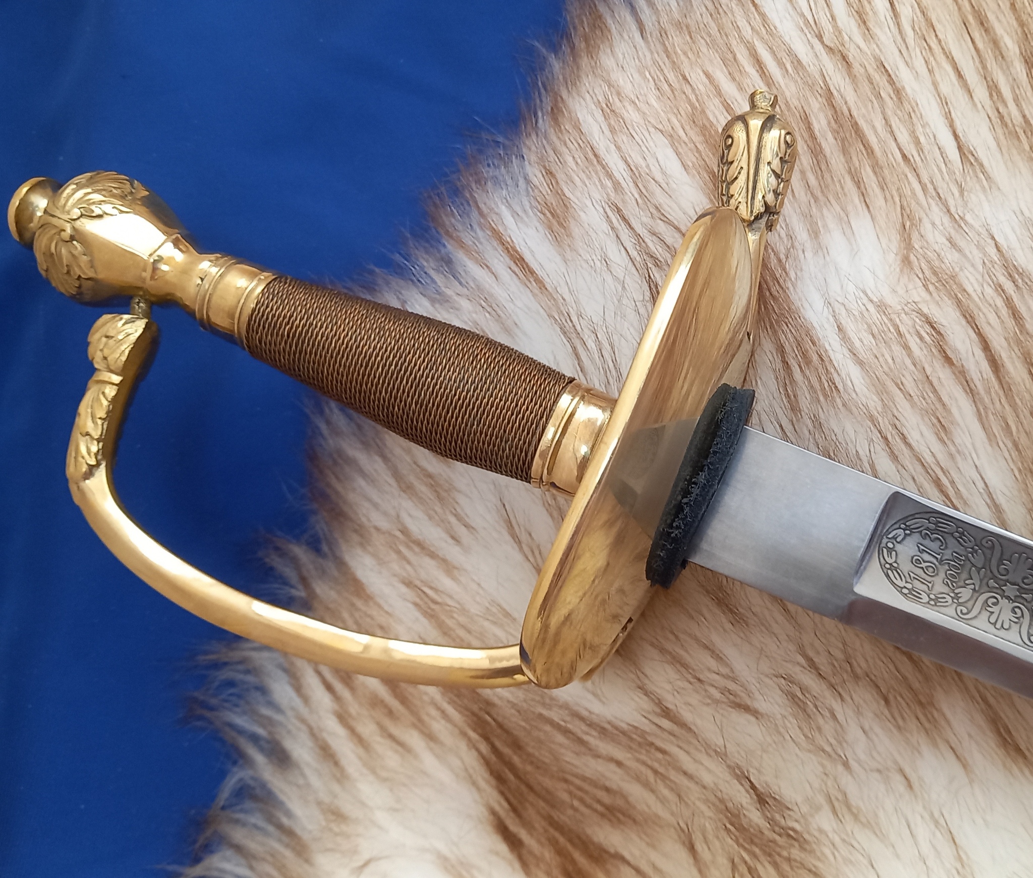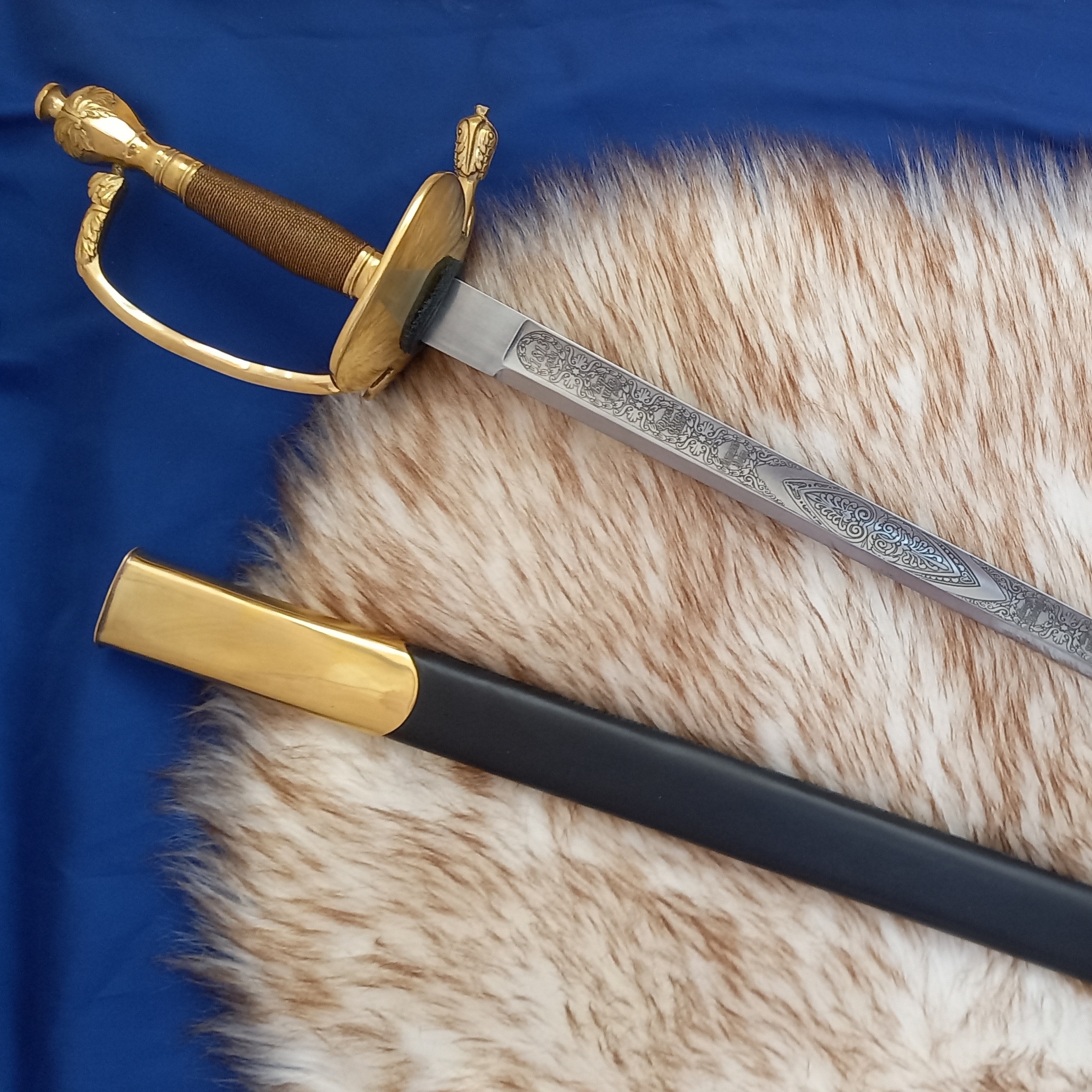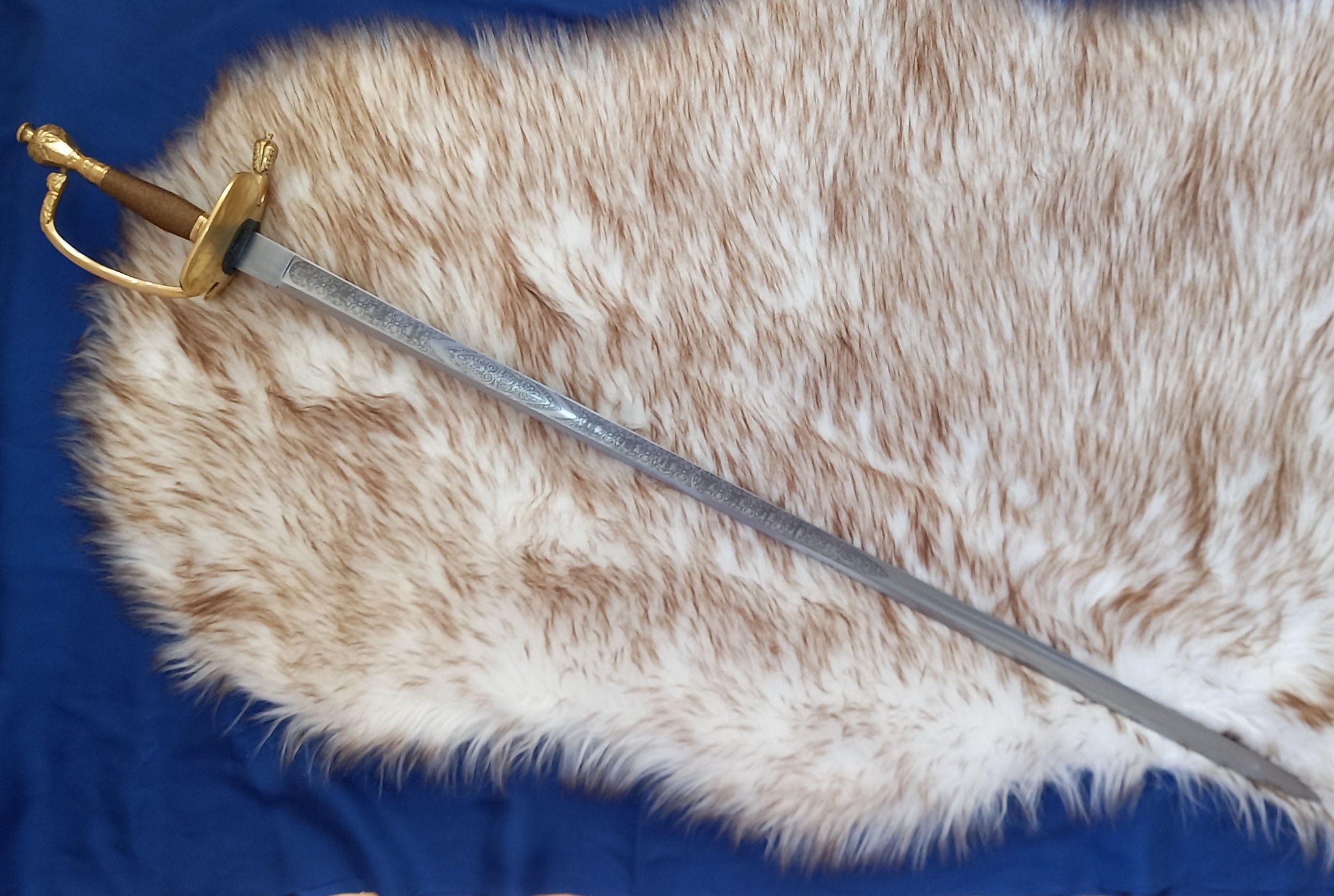 Клинок прямой, кованый, из высокоуглеродистой стали 65Г. Кромка клинка подготовлена под заточку. Хвостовик клинка цельнокованый, проходит сквозь всю рукоять. Клинок имеет один широкий дол с нанесенным узором методом химического травления в виде орнамента. Рукоять полностью отлита из латуни, с нанесенным узором. Ножны изготовлены из дерева, обтянуты натуральной кожей, приборы ножен латунные. Шпага дополнительно упаковывается в защитный чехол из винилискожи.