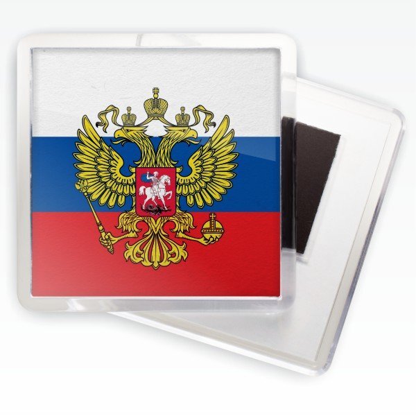 На квадратном рисунке магнитика «Президентский Штандарт» изображена официальная символика государства – золотой двуглавый орел на фоне флага России.