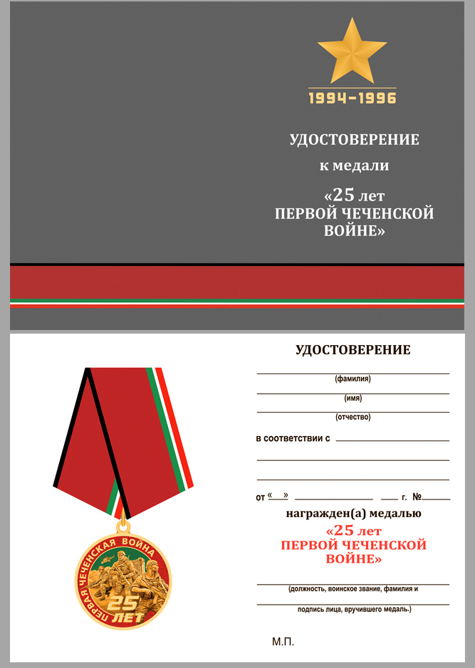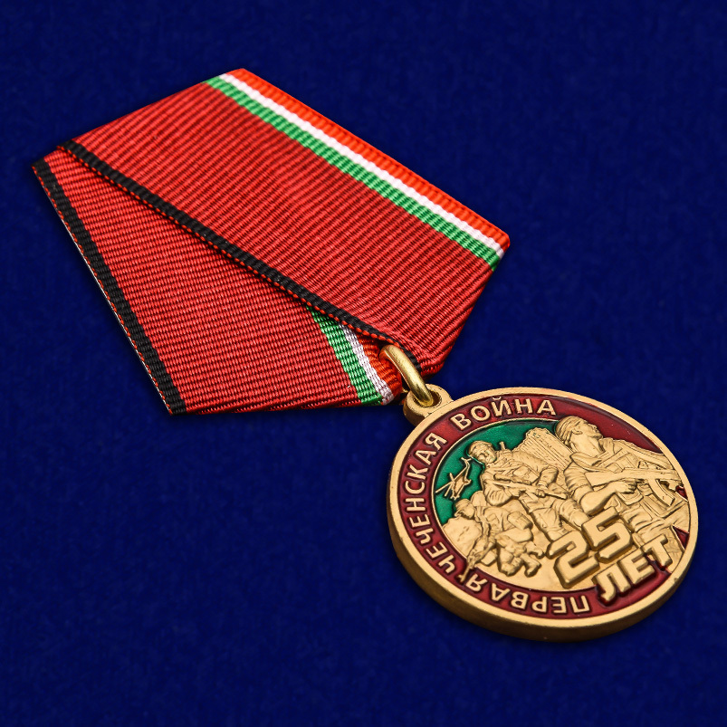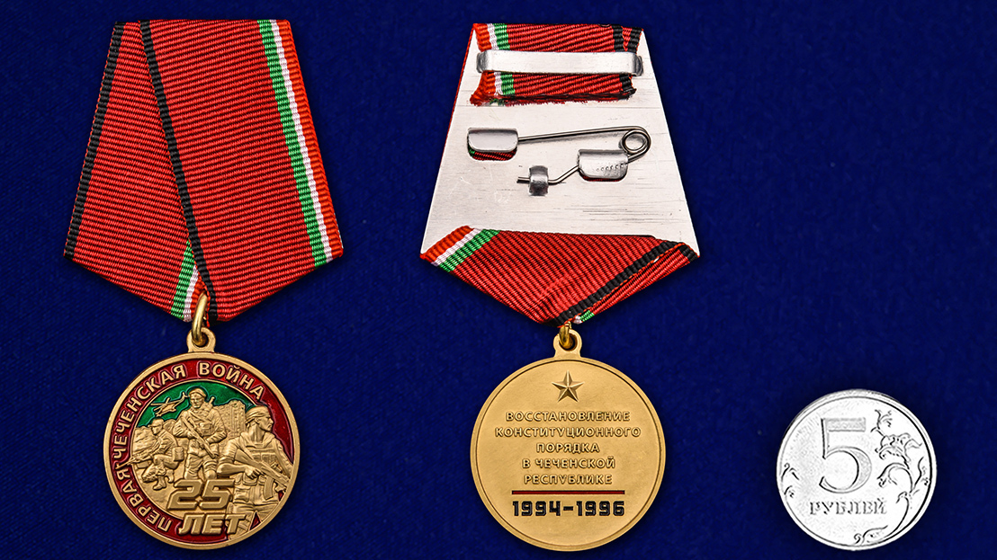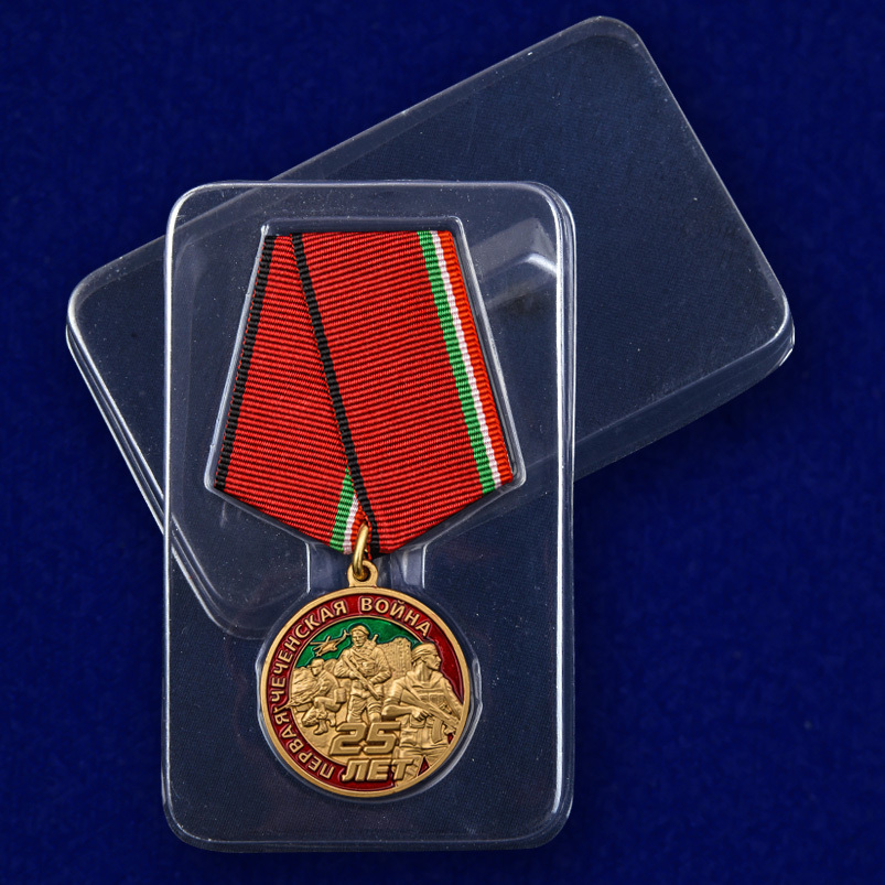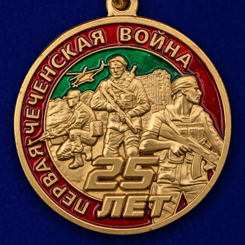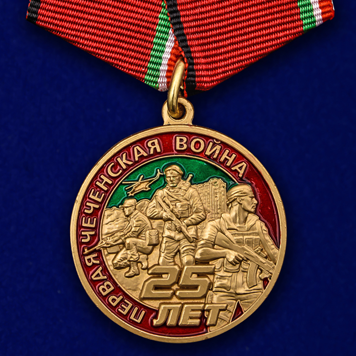 Медаль из латуни диаметром 32 мм золотистого цвета с эмалевым покрытием отдельных элементом. На аверсе тематическая композиция и надписи: "25 лет" и полукругом у бортика "ПЕРВАЯ ЧЕЧЕНСКАЯ ВОЙНА".
