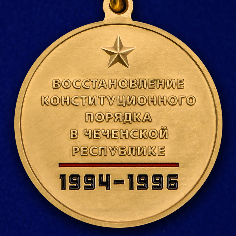 Реверс медали содержит рельефную надпись в 5 строках "Восстановление конституционного порядка в Чеченской Республики", ниже дата "1994-1996".