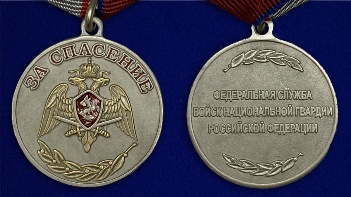 На аверсе помещена эмблема войск национальной гвардии России – золотой двуглавый орел с щитом и перекрещеными мечами. На груди его расположен треугольный щит с изображенным на нем всадником, поражающим копьем дракона. В верхней части медали крупными буквами надпись: “За спасение”. Внизу – лавровая ветвь. На реверсе в три строки выгравировано: “Федеральная служба войск национальной гвардии Российской Федерации”.