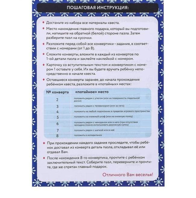 Всё, что нужно, — это правильно положить подсказки. Положите их в книги, обувь, спрячьте за часами и в других местах вашей квартиры. Следуйте правилам, и у вас всё получится!