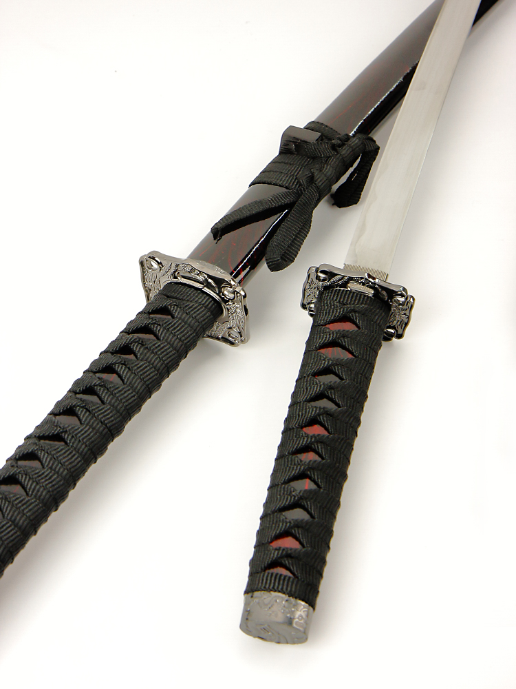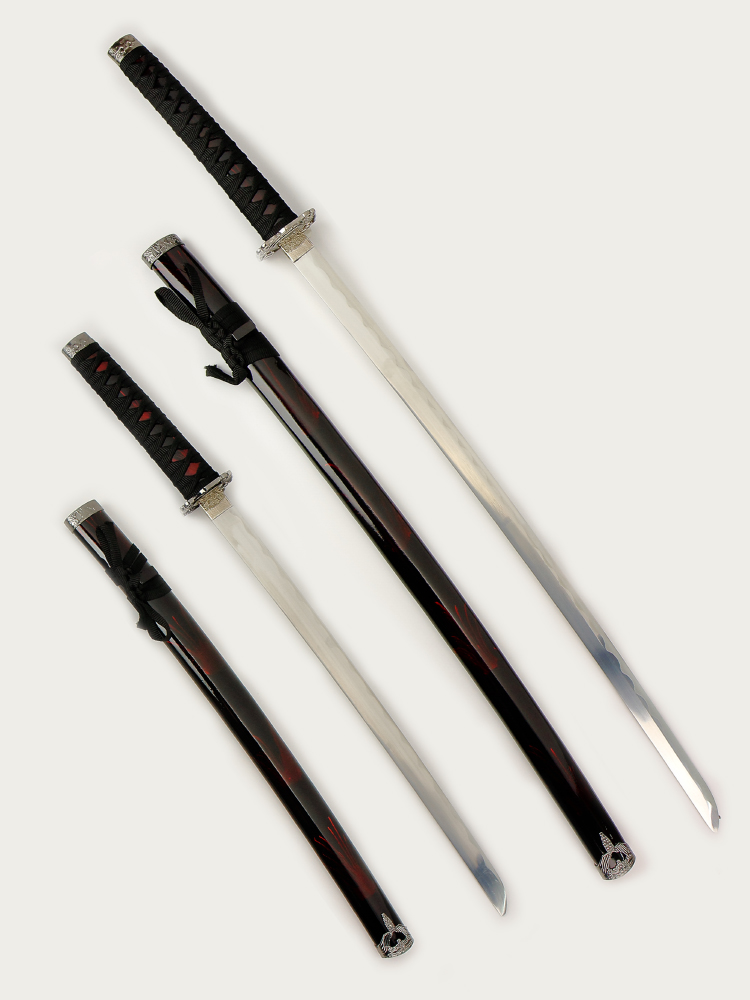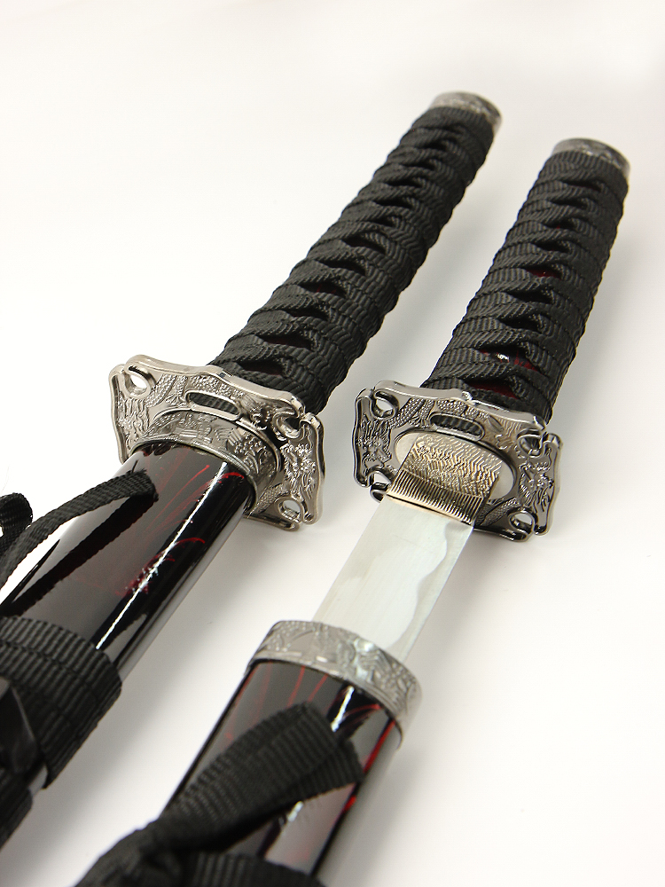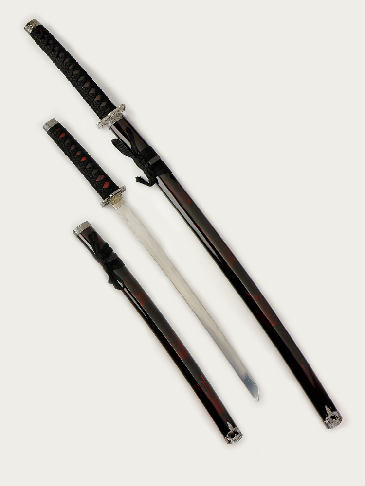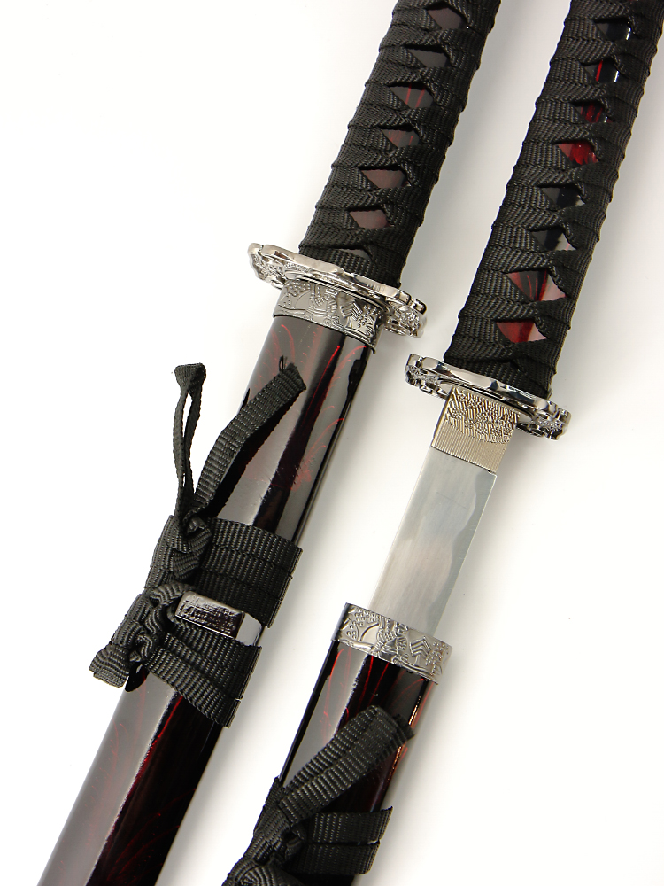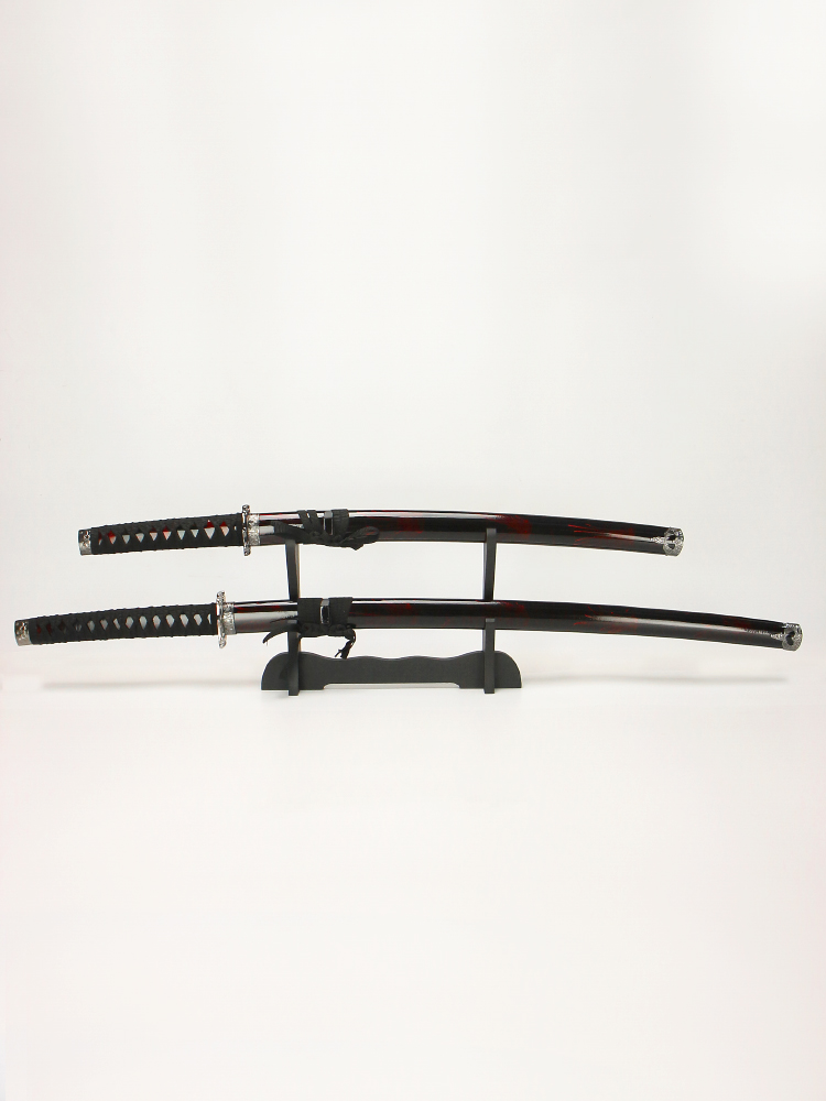 Набор самурайских мечей (катана и вакизаси) на подставке, ножны бордово-черный мрамор, цуба серебро