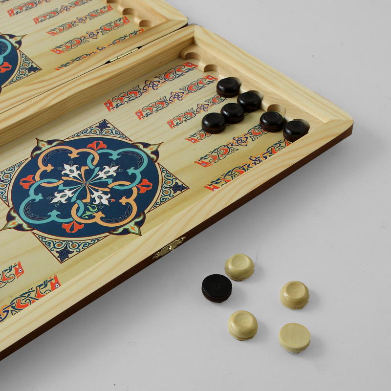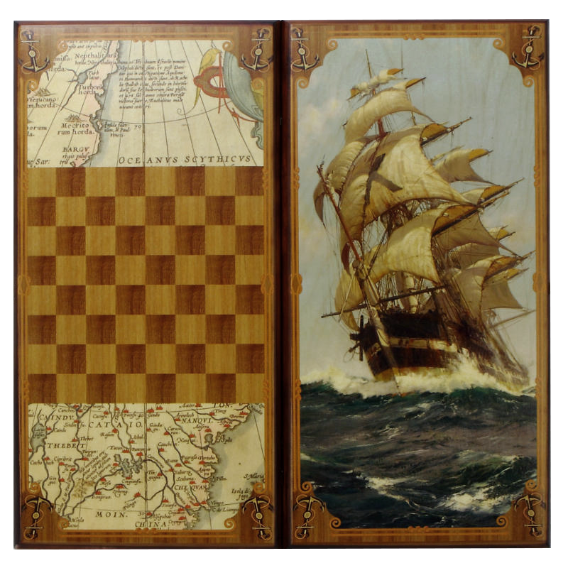 Нарды "Морские" большие SA-VD-L изготовлены из натурального дерева и представляют собой деревянный кейс с металлическими замками, размером 60 на 60 см в разложенном виде. Фишки также сделаны из дерева. Рисунок на нардах нанесен методом прямой печати по дереву. Внутренняя часть кейса - игровое поле для самой игры в нарды, одна из внешних сторон кейса - игровое поле для игры в шашки и шахматы.