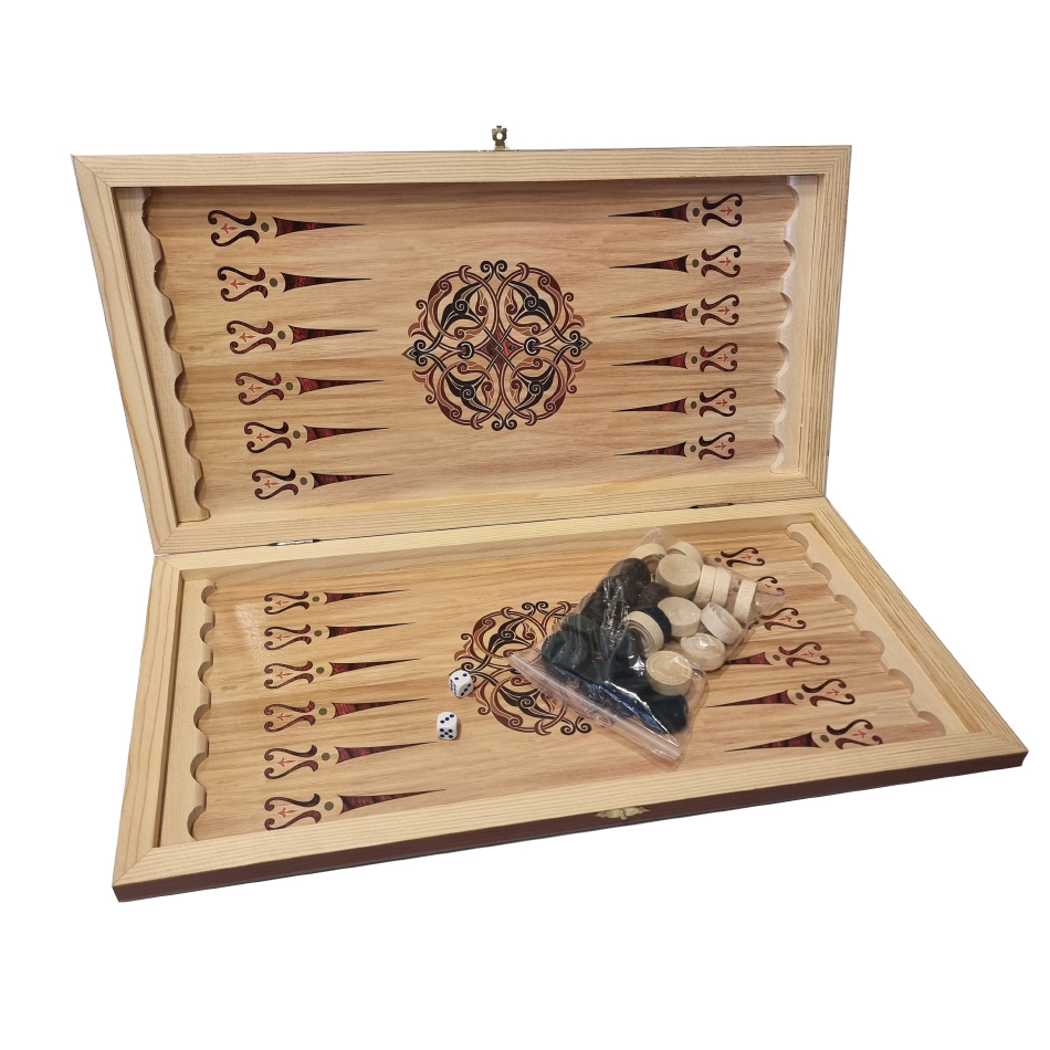 Внутри короба для шашек и нард обычно располагается игровое поле, разделенное на клетки для игры в шашки и треугольную доску для нард. Фишки для шашек и нард также изготовлены из дерева.