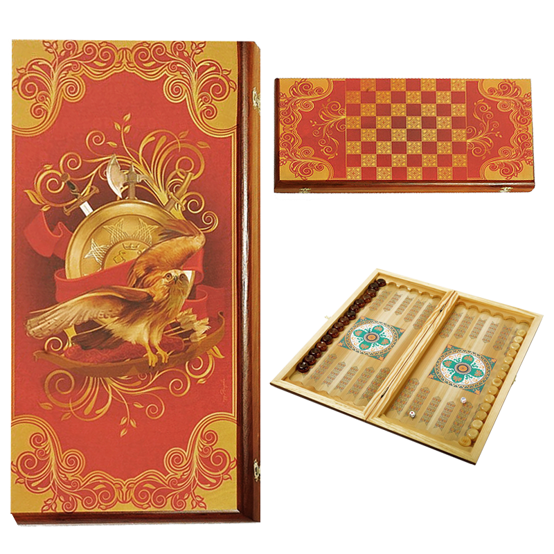 Игра нарды "Ястреб" средние SA-YA-M изготовлены из натурального дерева и представляют собой деревянный кейс с металлическими замками, размером 50 на 50 см в разложенном виде. Фишки также сделаны из дерева. Рисунок на нардах нанесен методом прямой печати по дереву. Внутренняя часть кейса - игровое поле для самой игры в нарды, одна из внешних сторон кейса - игровое поле для игры в шашки и шахматы.