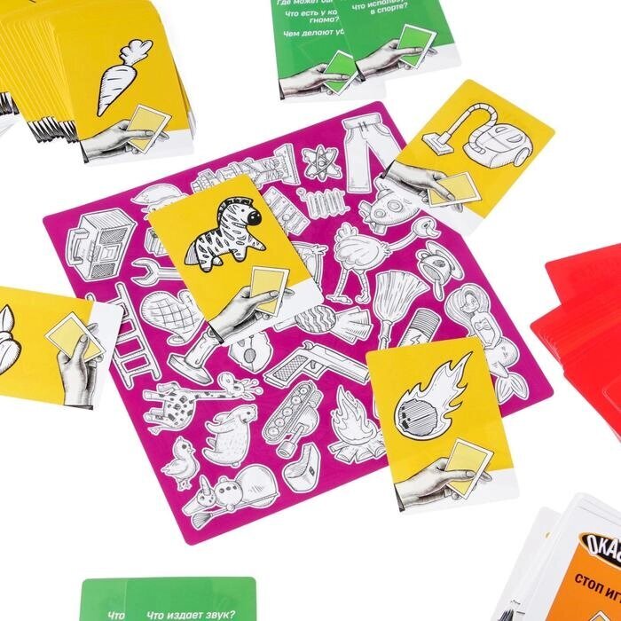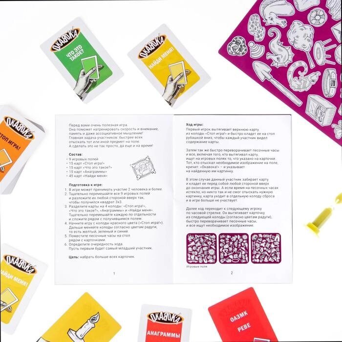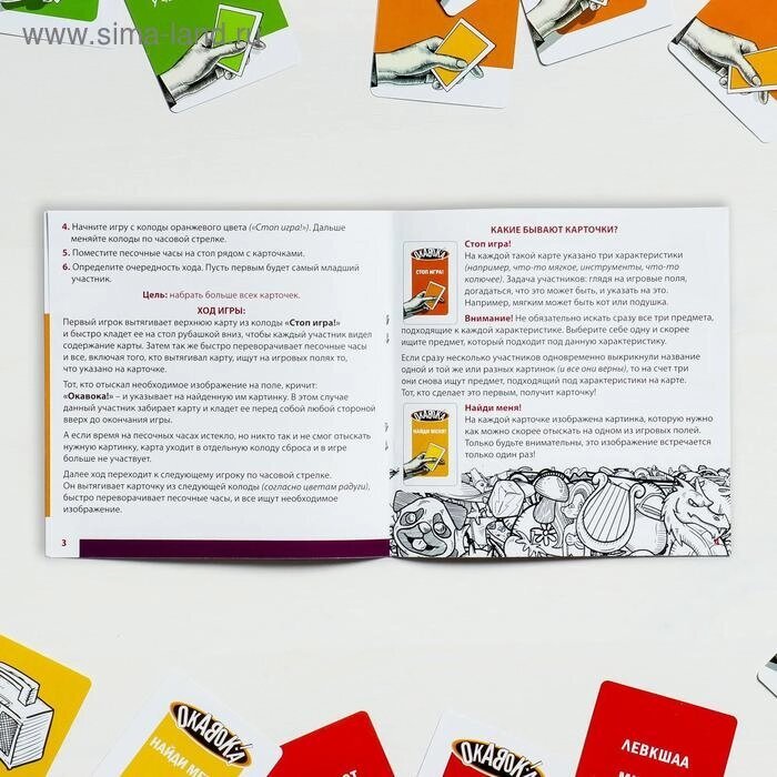 Вытягивайте карточки и выполняйте задания — ищите то, что изображено или написано на них. А если вам попадётся карточка «Анаграммы», то вы увидите на ней 2 слова, буквы в которых перепутаны. Задача игроков: понять, что это за слово и отыскать его на игровом поле. Карточку забирает тот игрок, кто быстрее всех найдёт нужный предмет и крикнет «Окавока!». Множество вариаций игры не даст вам заскучать, играйте с друзьями или всей семьей, проверьте свою реакцию и внимательность.