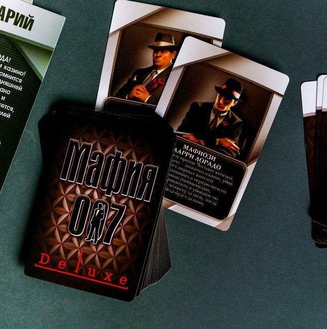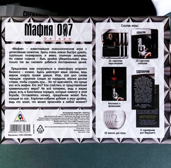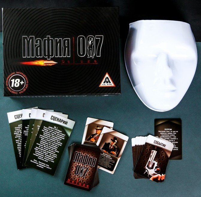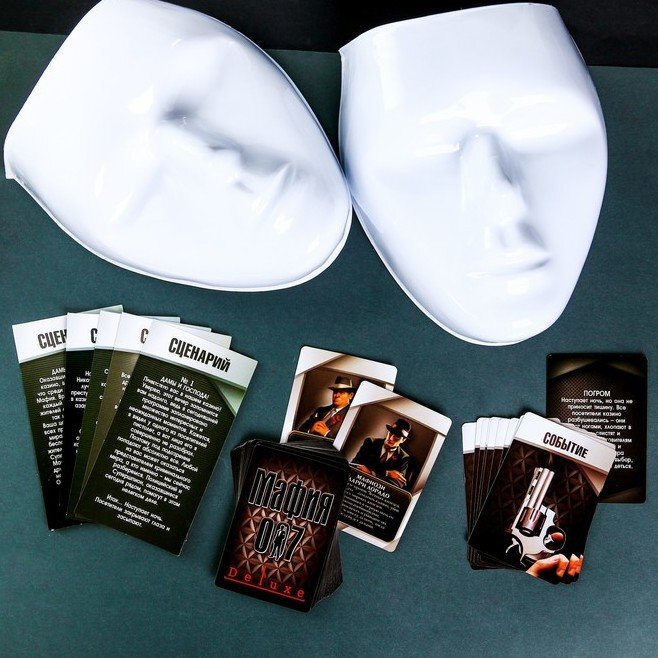 Эта «Мафия» уникальная, ведь в ней может случиться «погром» или «помутнение сознания». Всё это карточки с событиями, которые влияют на ход игры. В любой момент ведущий может выложить карту-событие, и тогда всем придётся играть по его правилам. Также мы подготовили 5 сценариев: разные завязки сюжета помогут внести разнообразие и задать игре неповторимый настрой.