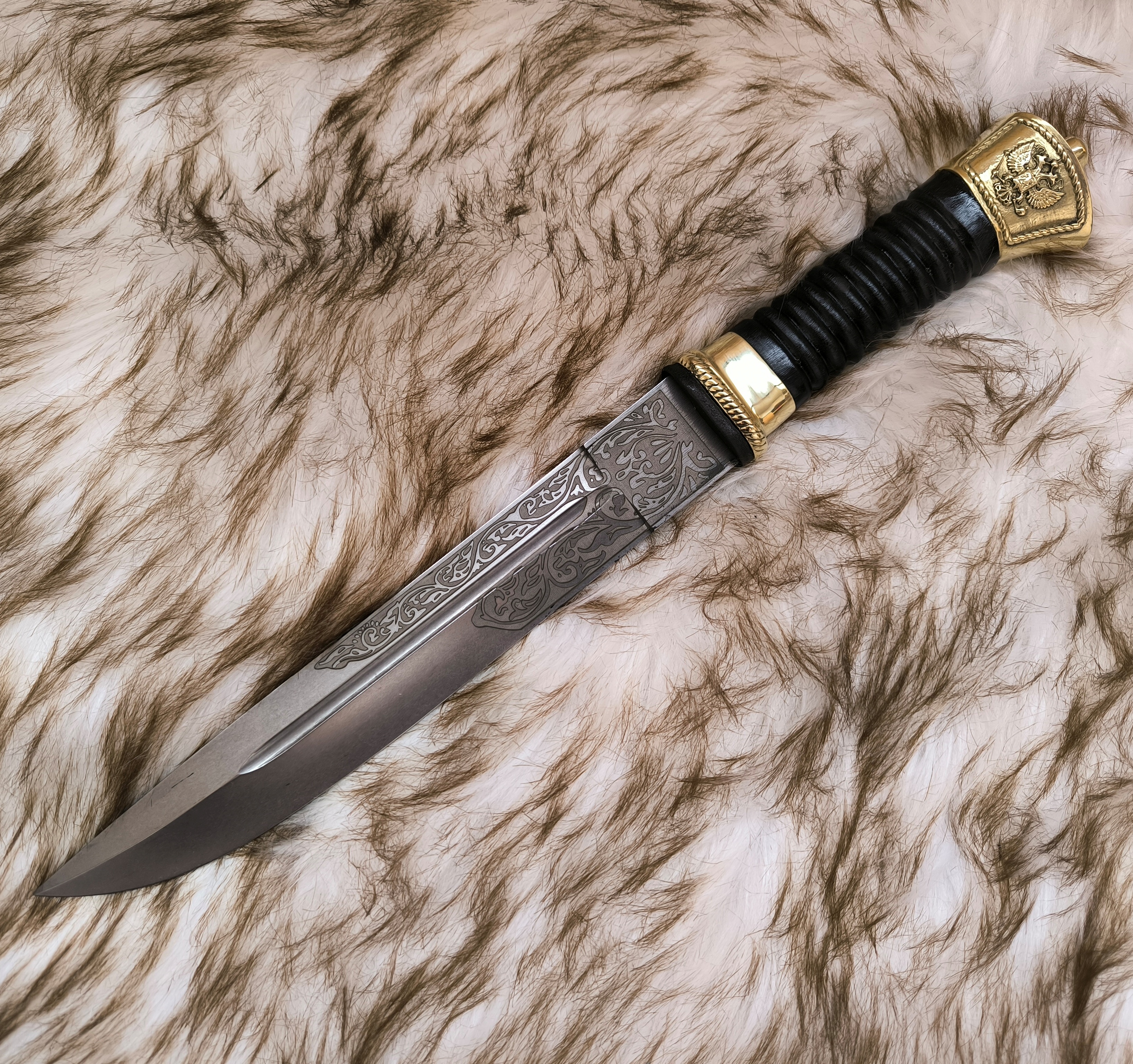 Клинок кованый, содержит один узкий дол, сталь высокоуглеродистая коррозийно-устойчивая 95х18, хвостовик клинка цельнокованый, проходит сквозь всю рукоять, снаружи стягивается гайкой. Кромка клинка подведена под заточку. На клинке методом химического травления нанесен узор в виде традиционного орнамента. Рукоять из березы, с продольными желобками, покрыта лаком. Приборы рукояти из латуни.