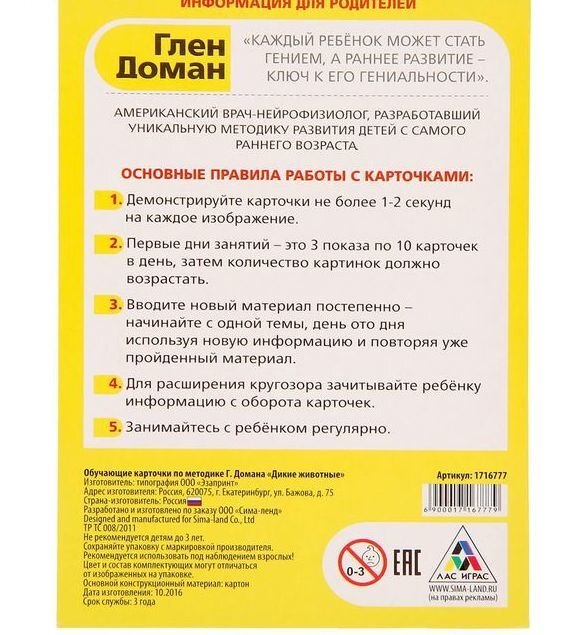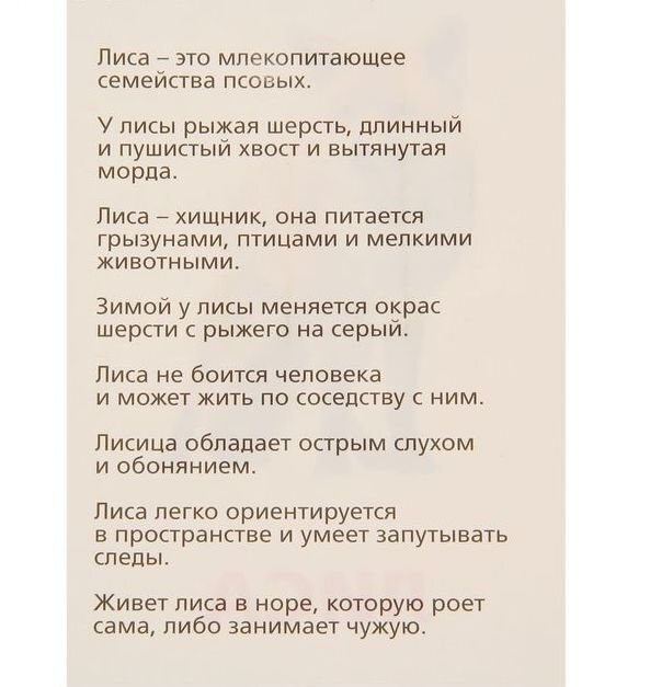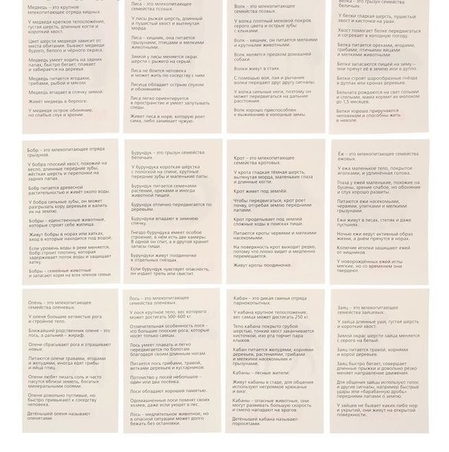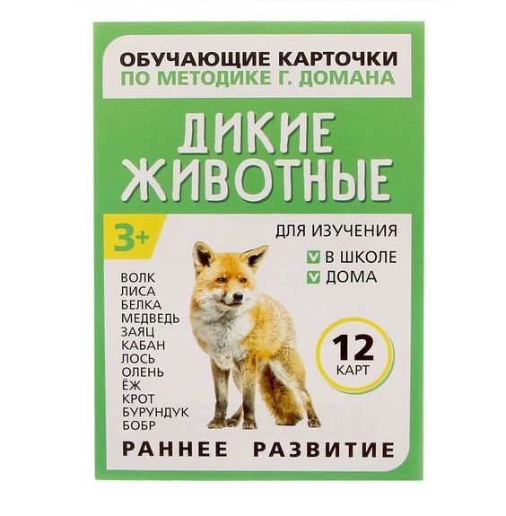 В этом наборе вы найдёте 12 карточек с дикими животными. Название каждого написано красным цветом, как и полагается по методике Домана, и сопровождается фотографическим изображением. На обороте карточек вы найдёте интересную информацию о каждом животном. Когда малыш станет старше, зачитывайте ему познавательные факты о диких обитателях леса.