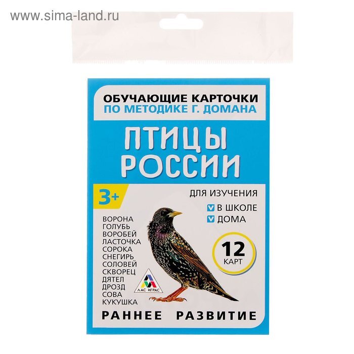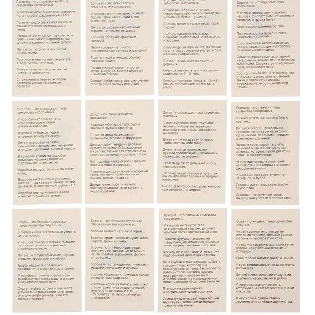 В этом наборе вы найдёте 12 карточек с птицами России. Название каждой написано красным цветом, как и полагается по методике Домана, и сопровождается фотографичным изображением. На обороте карточек вы найдёте интересную информацию о каждой птице. Когда ребёнок станет старше, зачитывайте ему эти познавательные факты.