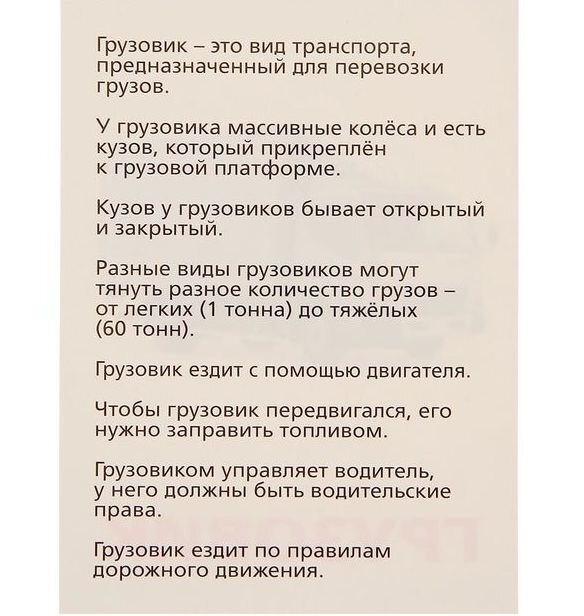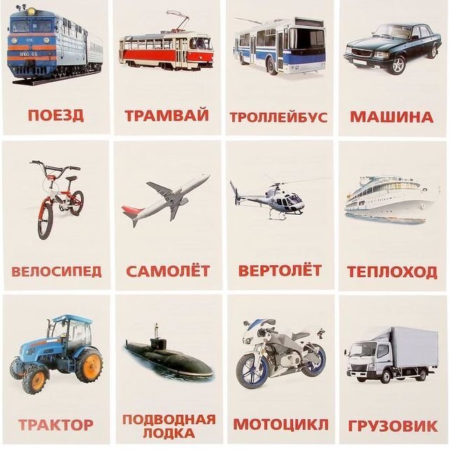 В этом наборе вы найдёте 12 карточек с видами транспорта. Название каждого написано красным цветом, как и полагается по методике Домана, и сопровождается фотографичным изображением. На обороте карточек вы найдёте интересную информацию о различных видах транспорта. Когда ребёнок станет старше, зачитывайте ему эти познавательные факты.