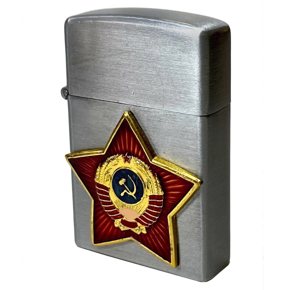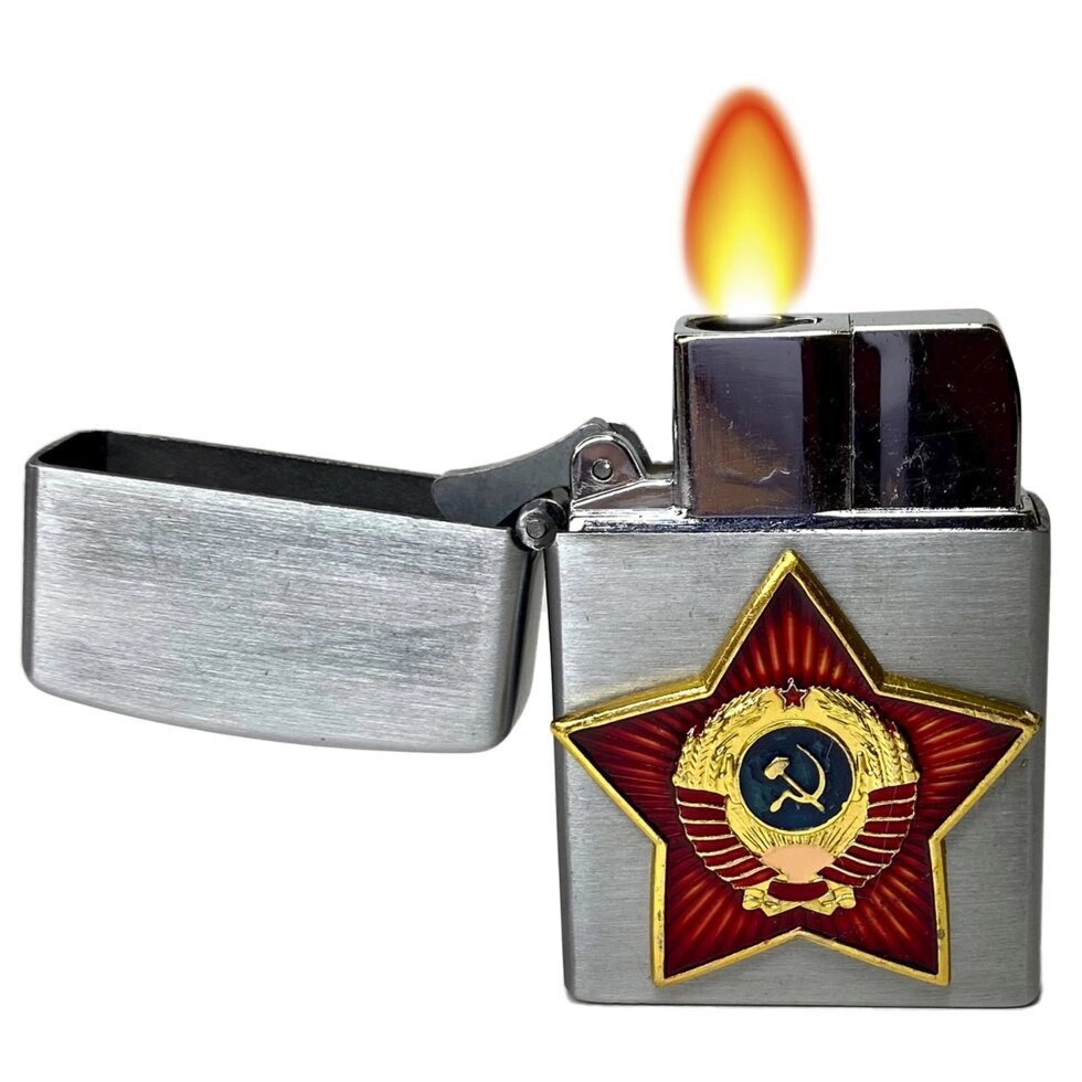 Оригинальная откидная зажигалка "Советский Союз" с металлической накладкой авторского дизайна. Недорого купить газовые зажигалки с оригинальными накладками можете с доставкой или самовывозом в магазине "Особый Случай".