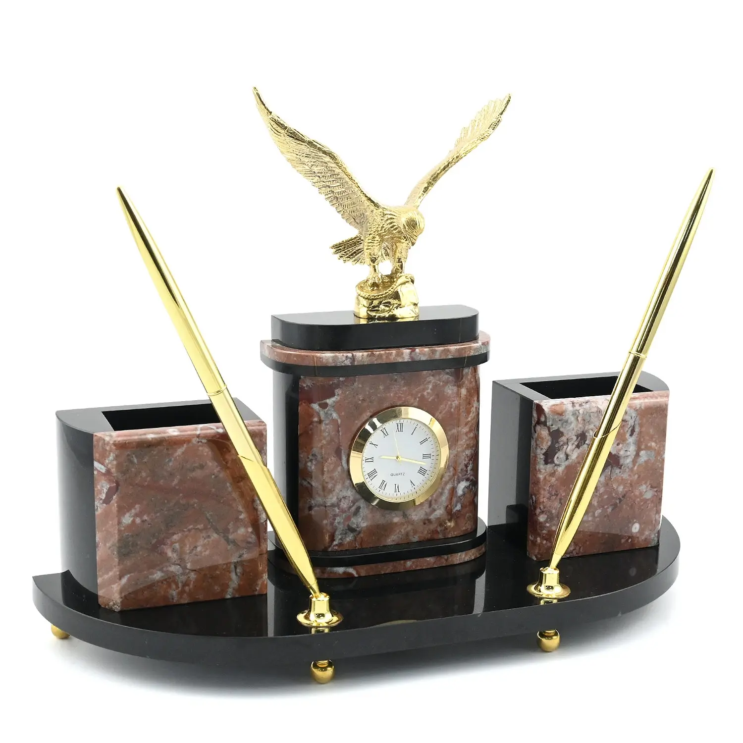 •Писменный прибор изготовлен вручную из натурального камня с элементами из бронзы. Установлен кварцевый механизм.