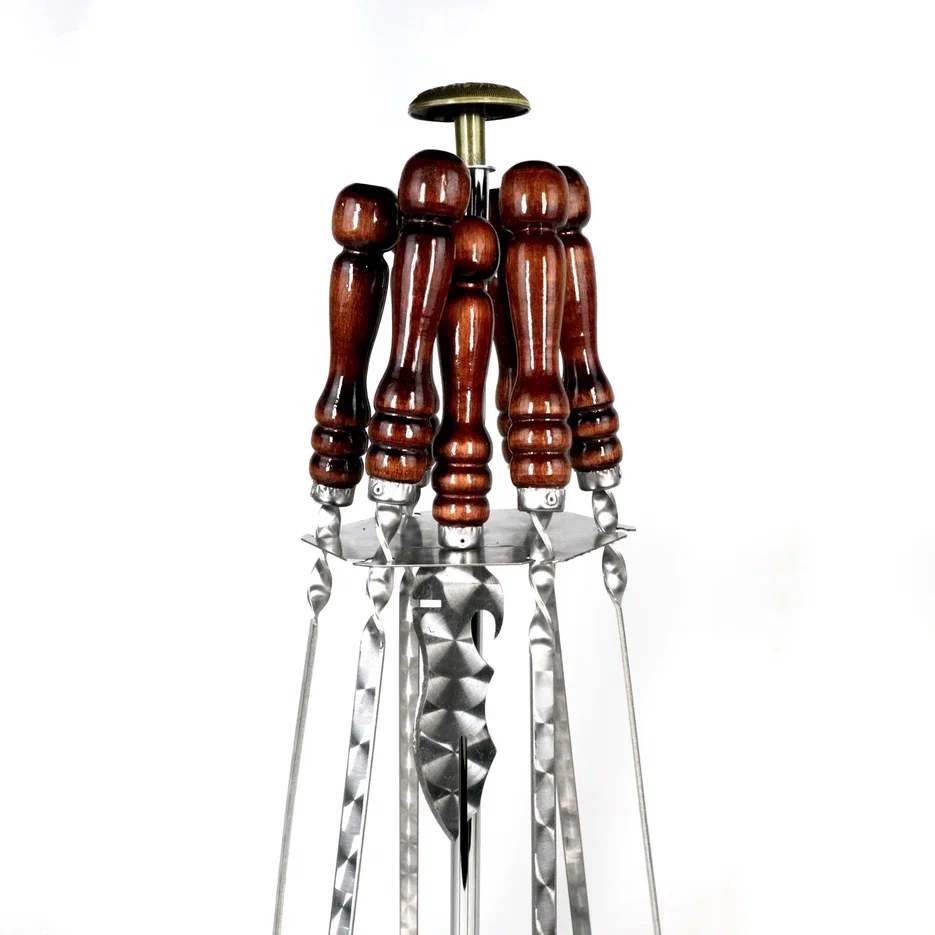 Все элементы подноса (кроме узорчатого навершия стойки) изготовлены из нержавеющей стали. В подносе есть место как для углеи (для подогрева готового шашлыка), так и для продуктов.
