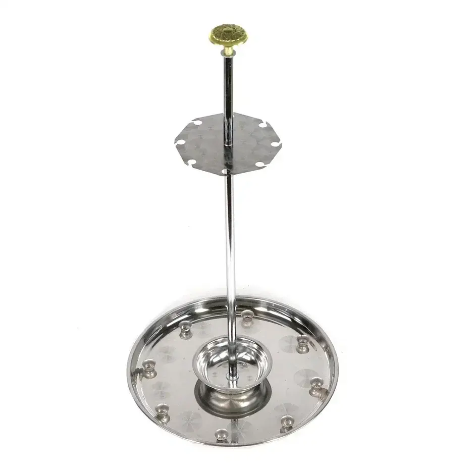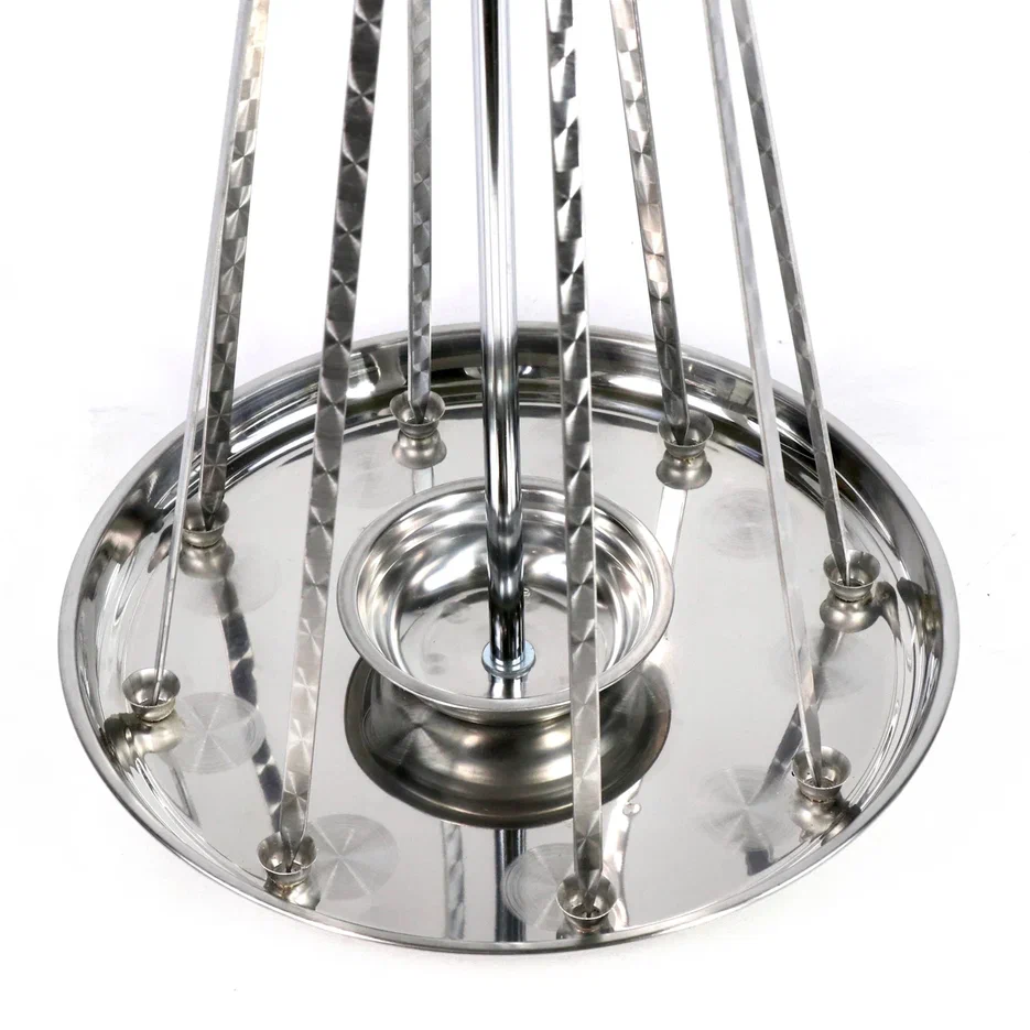 Все элементы подноса (кроме узорчатого навершия стойки) изготовлены из нержавеющей стали. В подносе есть место как для углеи (для подогрева готового шашлыка), так и для продуктов.