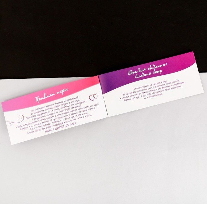 В этом наборе вы найдёте 10 советов, которые помогут вам организовать идеальный вечер любви. Для того чтобы вы открылись друг другу с новой стороны, здесь собраны лучшие романтические игры. Выберите листочек с той, которая понравилась вам больше всего, и вручите его партнёру.
