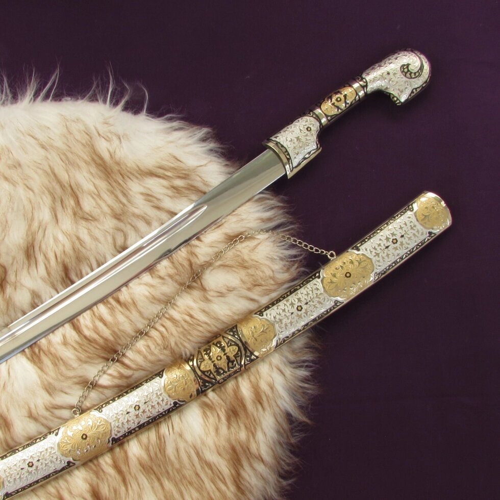 Ножны украшены мельхиором и эмалью с традиционным кавказским рисунком.